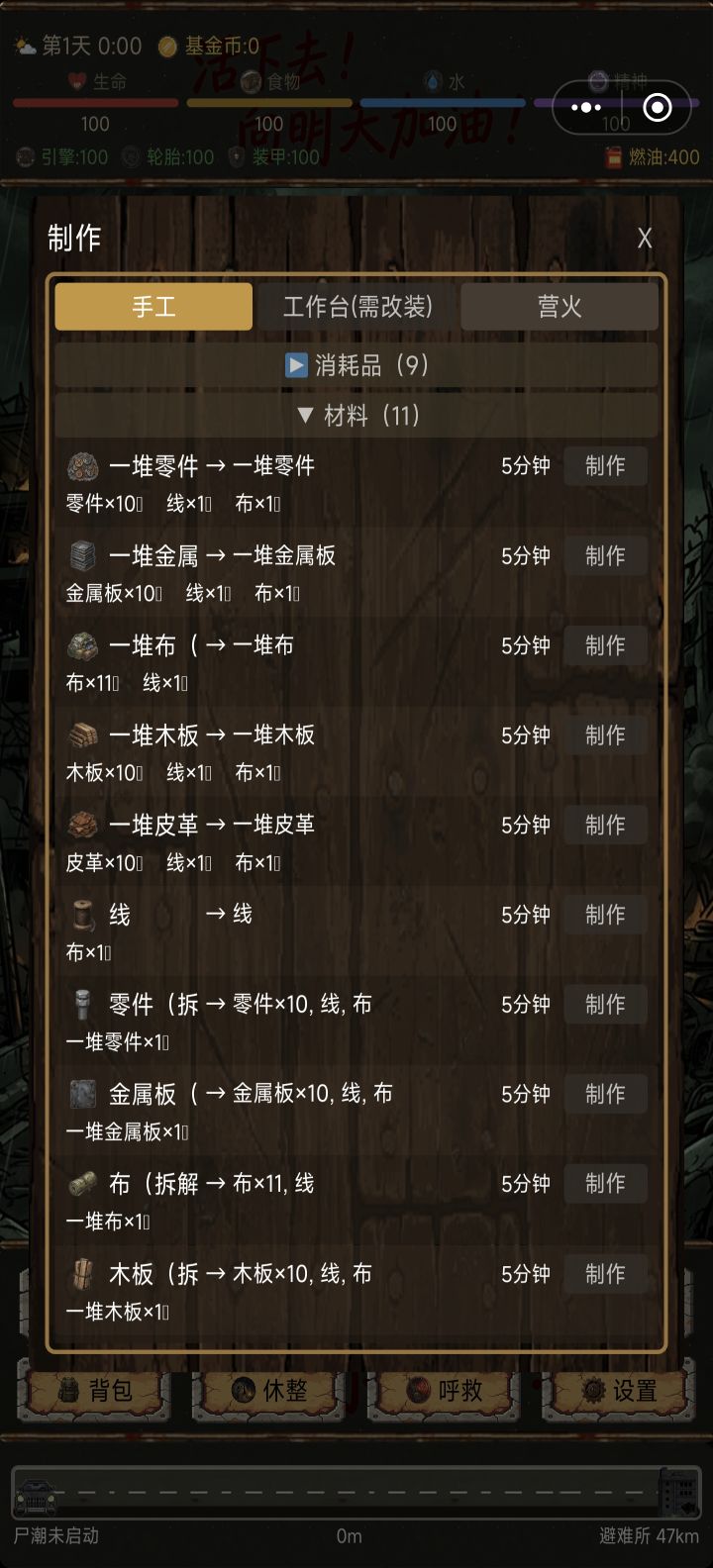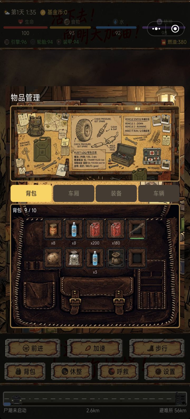 因为游戏本身很简单只是新手期有几个小坑。所以提醒一下注意小坑就行。这游戏只会在新手期和开局死!所以平稳度过开局就好。开局,无脑呼救选+80油。一路直接加速开车,遇到各种探索废墟先不要进去。等刷尸潮先。等距离拉开到20km以上,可以去探索一下工厂或者汽修店拿升级材料。尽量保持和尸潮距离在10km以上,因为精神不够无法移动,休息时尸潮就赶上来了。所以保持安全距离。前期只打一个的小怪。遇到两个以