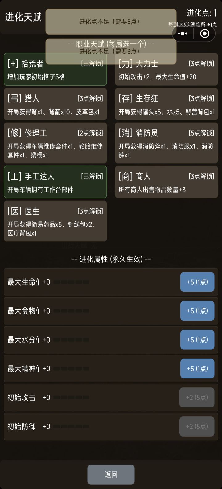 1.修复手套装备不显示bug2.修复背包饰品无法出售商人的bug3.修复进化点不增加的bug4.修复双手武器问题5.修复无法步行的问题6.修复怪物不掉落物品的问题7.修复失去车辆后获得物品还会进入车厢的问题8.增加交易长按速度9.增加背包一键整理10.步行前增加弹窗提醒11.增加公告12.修复天赋不生效的问题13.增加司机职业,增加减少耗油天赋,每局可选天赋改为2