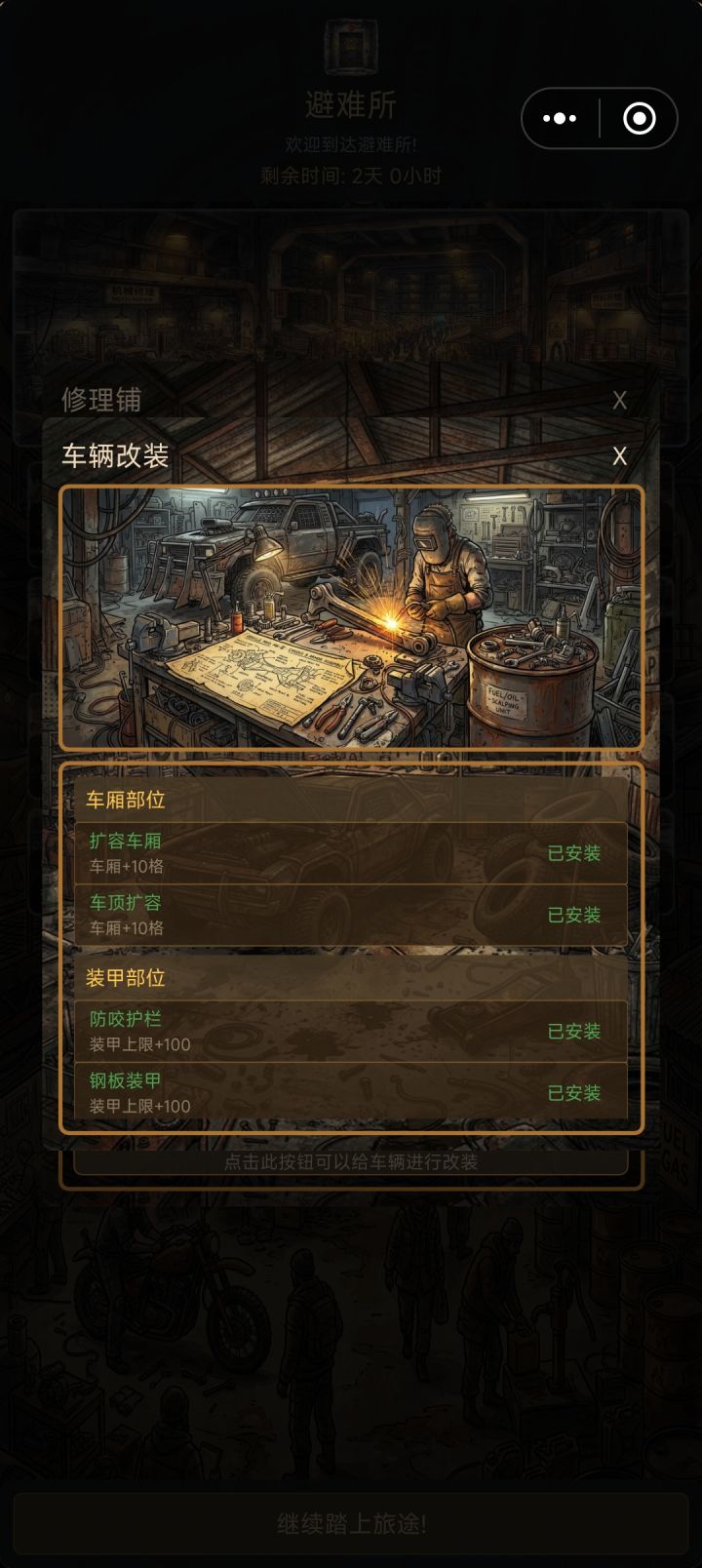 满级镇楼bug反馈:改装后不能连续改装,会吞材料,要退出这个界面重新进去才行新手攻略:开局嗷嗷加速,直到车载配件变红再普通前进,遇到怪直接逃跑,木板不用拆,拆金属板,第一次到避难所,把值钱的和电路原件,橡胶,金属板,还有延缓尸潮速度的那个全部塞进保险柜,然后送死,开第二把,还是搜电路原件,橡胶,金属板,想办法开进避难所,然后取出保险柜里的东西,改造先改油,个人喜欢再改容量,接下来基本上想怎么玩