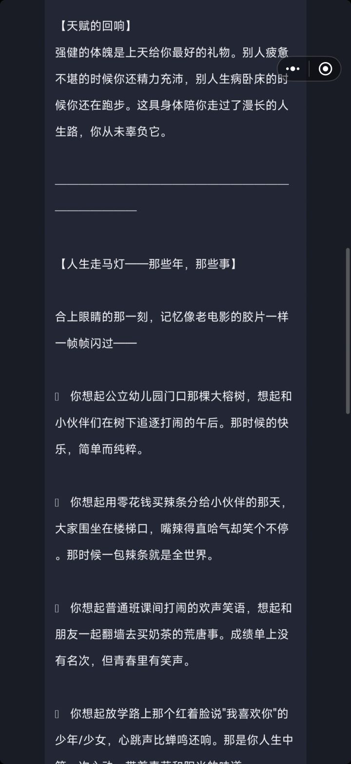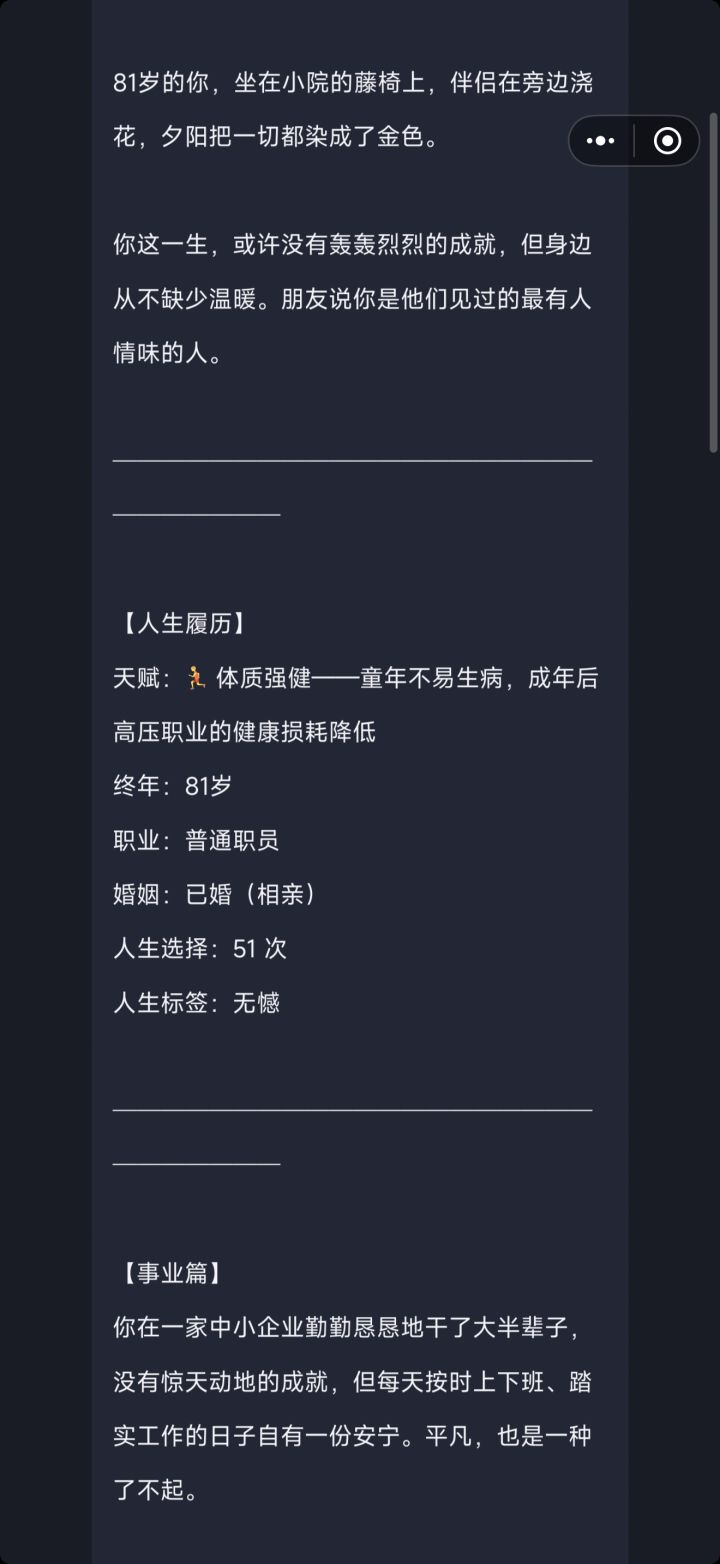 虽然很简单的文字游戏,但是很多选择是我曾经回不去的遗憾再一次用游戏来体验了曾经的遗憾,得到的结果挺触动的,虽然也有小 bug 但是能接受相信作者会好好完善