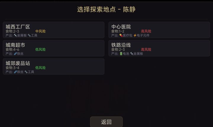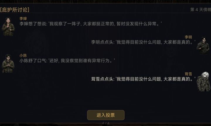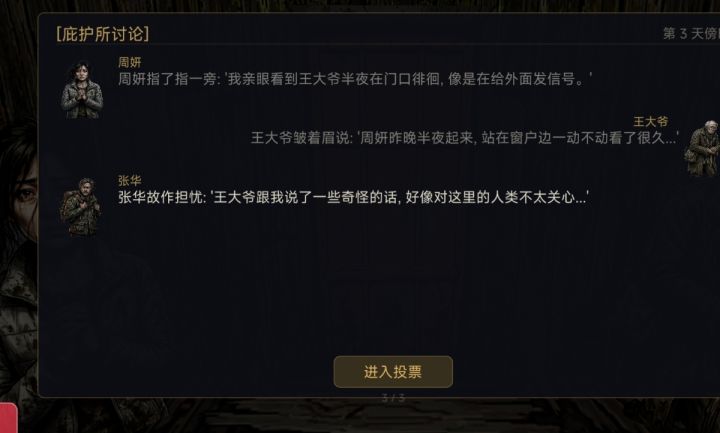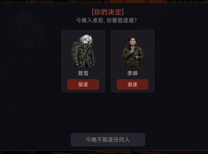 目前玩了几轮,随时补充问题1:发现正常人类角色派遣出去会被感染。但是没找到规律,回来之后能从对话、顶部弹窗反应、或者派遣结果,得到提醒吗?入夜前发现,是不是就可以驱逐躲避掉?或者小陈的侦查作用放在入夜前会不会好一点,现在是早上,但是早上基本上都死了一个了也不用小陈侦查了2:感觉顶部弹窗挺有意思的,可以随机弹出来写被感染的人的反应,比如呼吸断断续续?眼神呆滞?然后还可以给点会误导的
