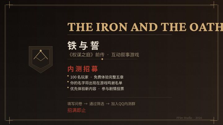 各位领主大人好,我是《权谋之庭》和《铁与誓》的开发者FFire。《铁与誓》第二章"萌芽"已经完成开发,现在招募100名内测玩家,免费体验第二章到第五章的完整内容。**什么是《铁与誓》?**《权谋之庭》的前传。你将扮演那位"被毒杀的父亲"——卡尔·冯·艾登,从他5岁一直到49岁去世。你做的每一个选择,都在塑造《权谋之庭》里那个"你从未见过的父亲"。**内测内容**- 第二章"萌芽"(131