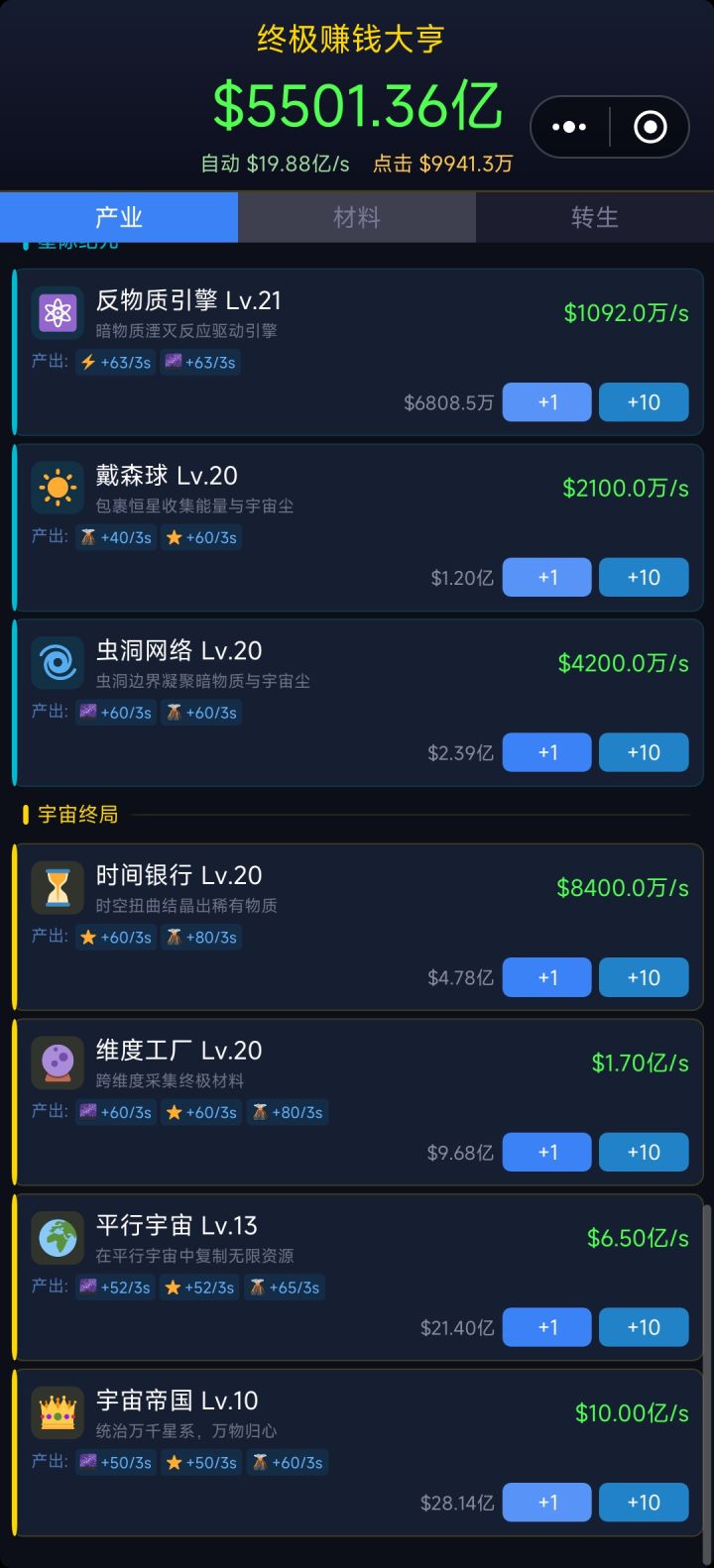 10分钟不到就穿了。不用点击,每个产业20级就够了。强烈出其他玩法