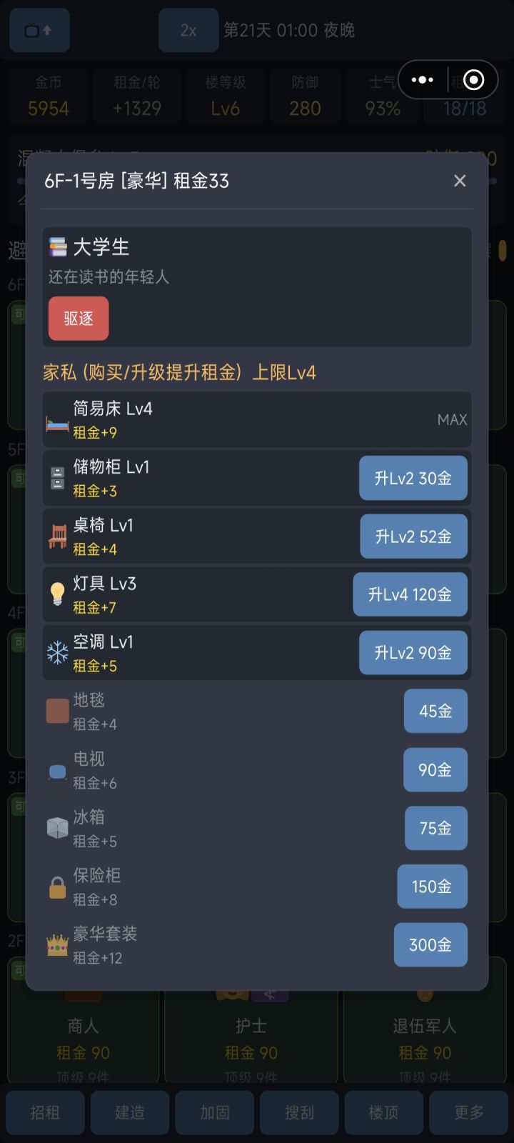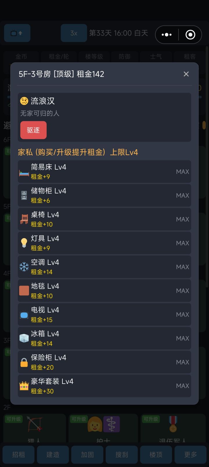 1.增加一键升级房屋。2.那些租客(流浪汉)他住的起那么贵的房子吗?3.自己也需要额外的金钱来源,楼顶丧尸一块两块的+钱太少了。4.产能不足,上限低。无法持续游戏。5.角色单一。改了再玩。