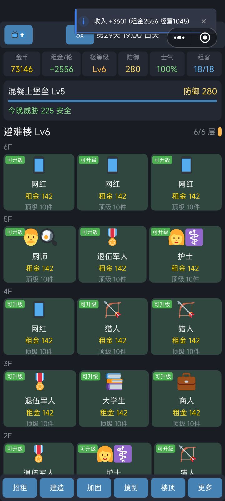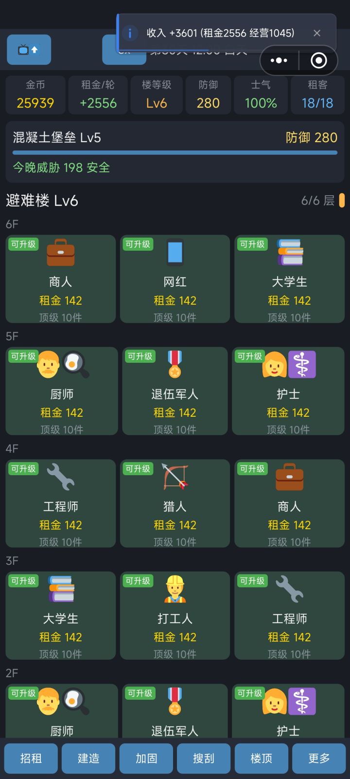 白天没人出门怎么赚钱?而且丧尸来了,哪怕满级防御也防不住。
