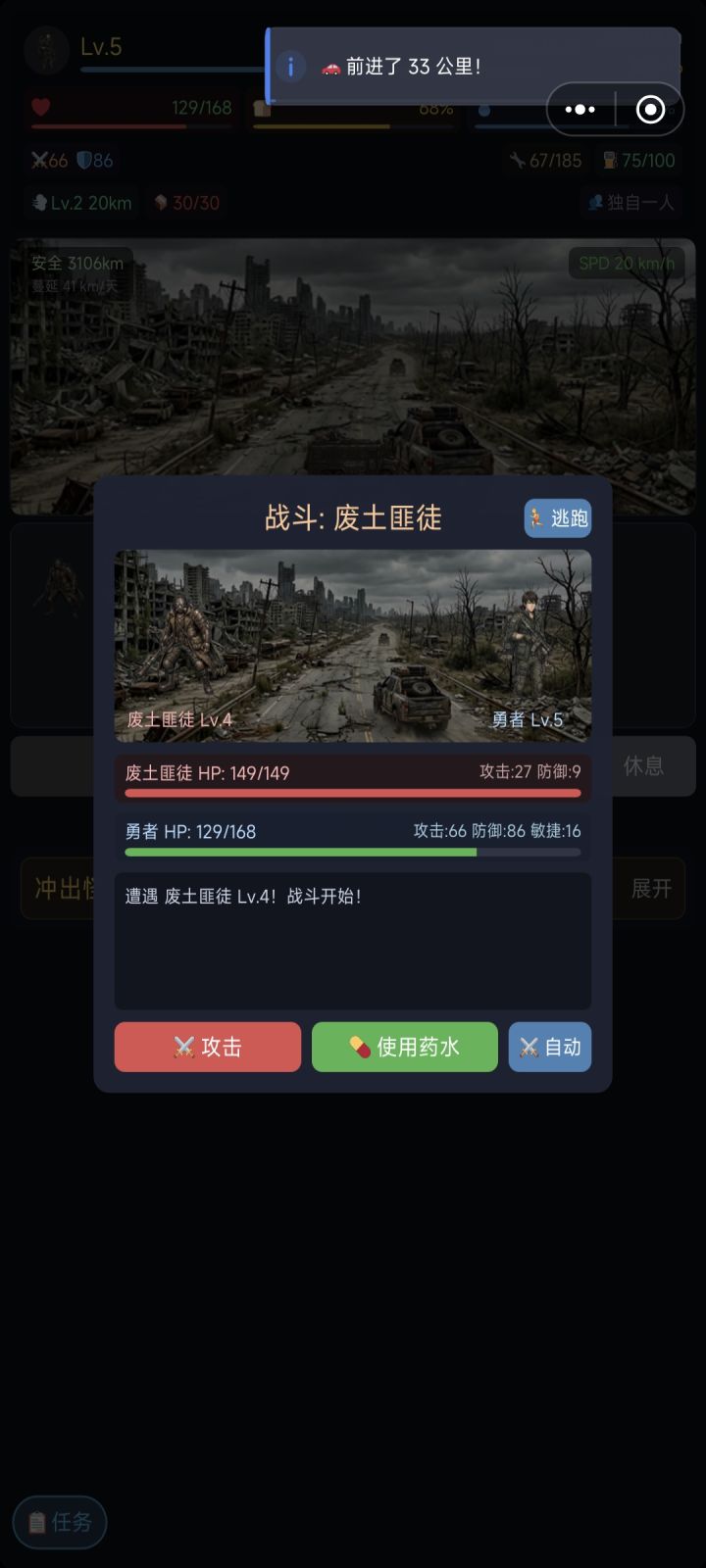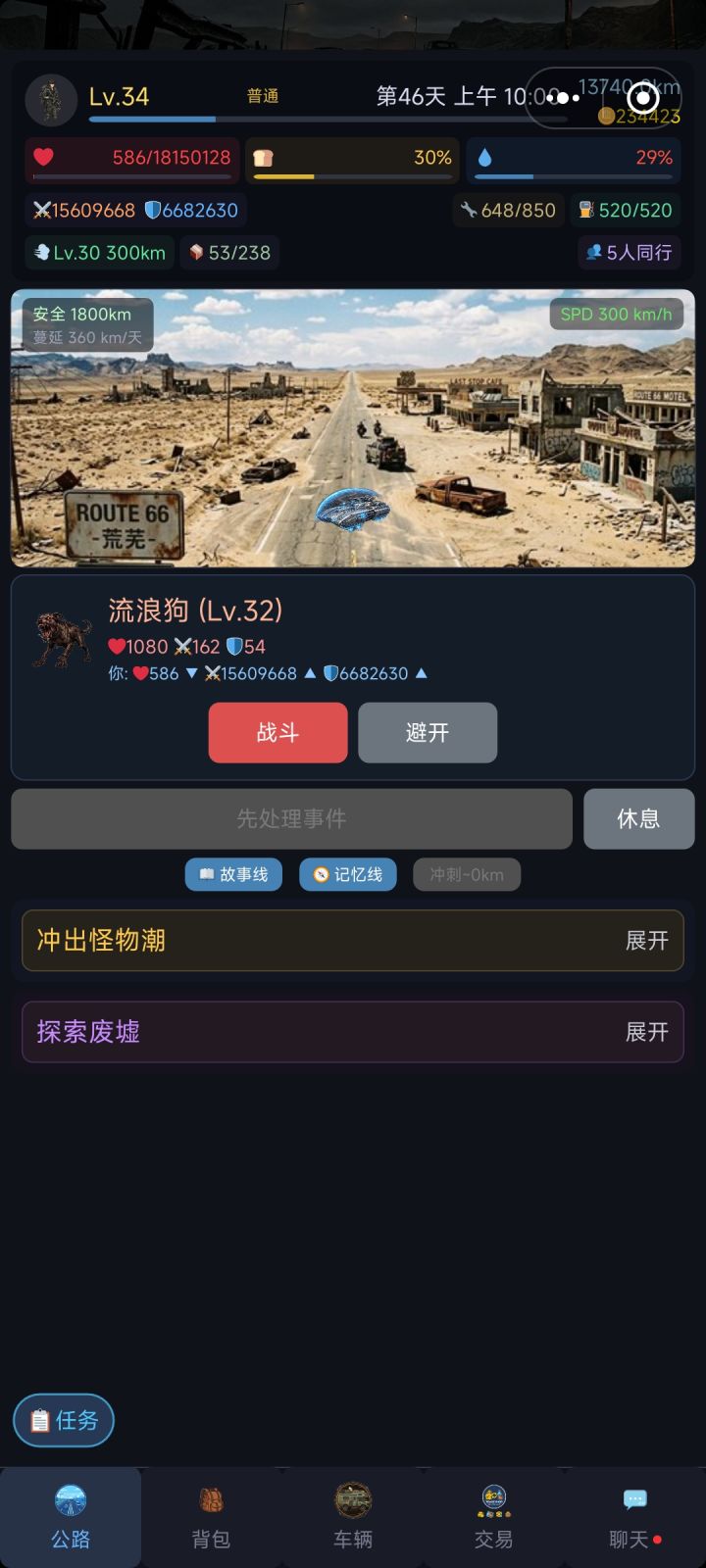 开局尽早冲怪潮,必拿拜金女,医生npc,买一堆土壤和草莓种子,npc自动出产金币,没钱就休息,有钱就买个顶级衣服冲怪潮,怪潮冲完,有钱买身橙色装备先。升级车:车背包300格够用就行>速度拉满0。5km>耐久2000最低>油箱2000左右废墟探不探索感觉作用不大(关键是前面根本打不过)建议:1、给废墟加个探索完成给点属性加成什么的 2、战斗加速 3、 一键加油和修理,特别是强化车车还得一个