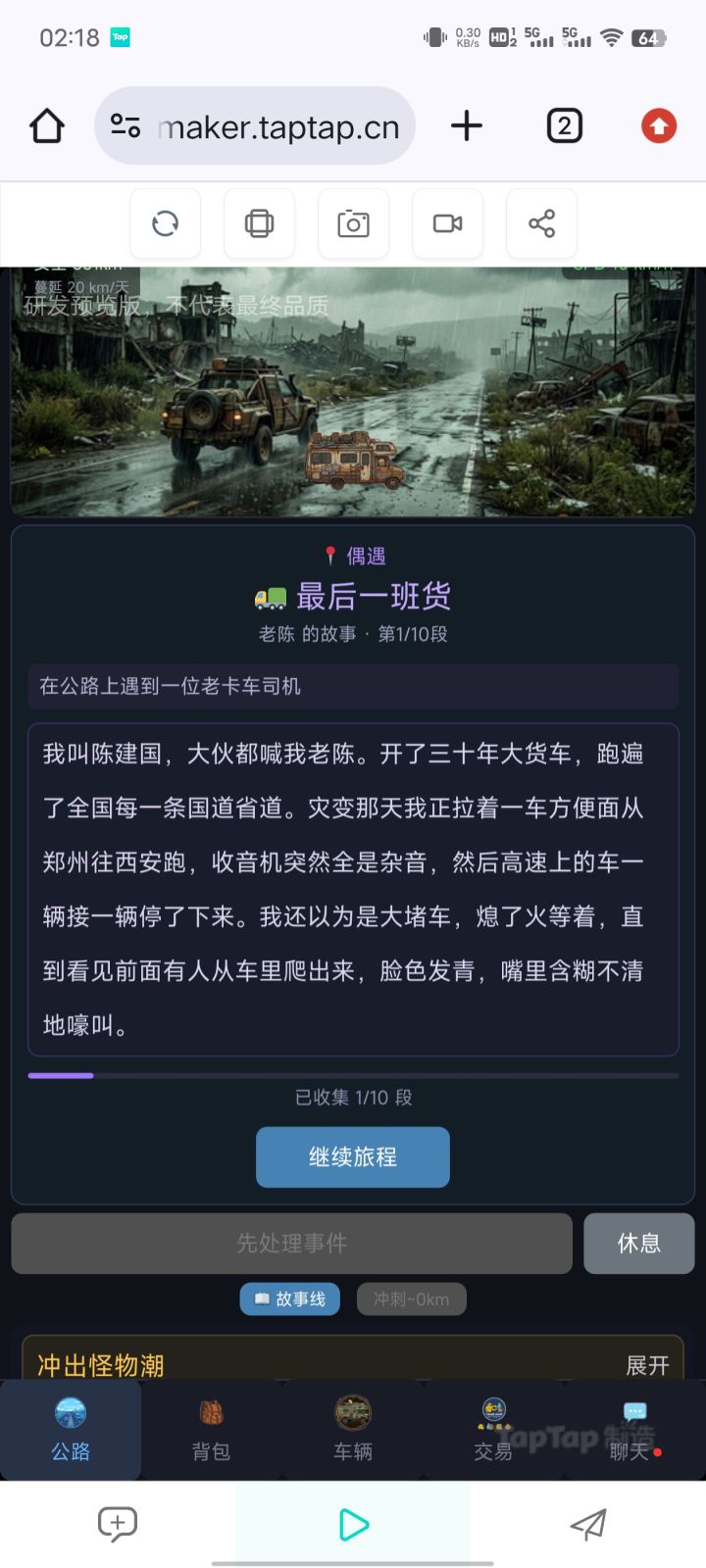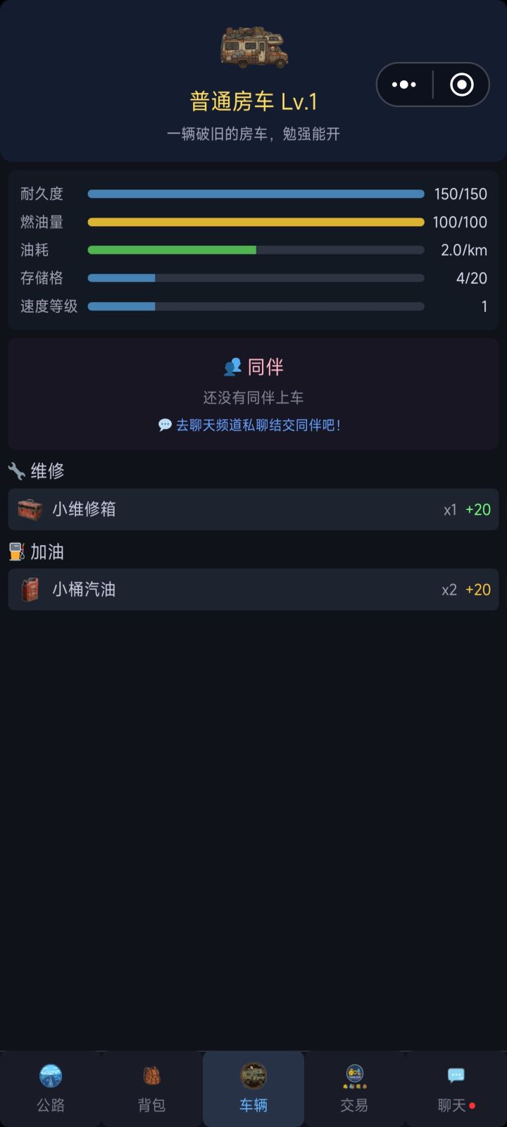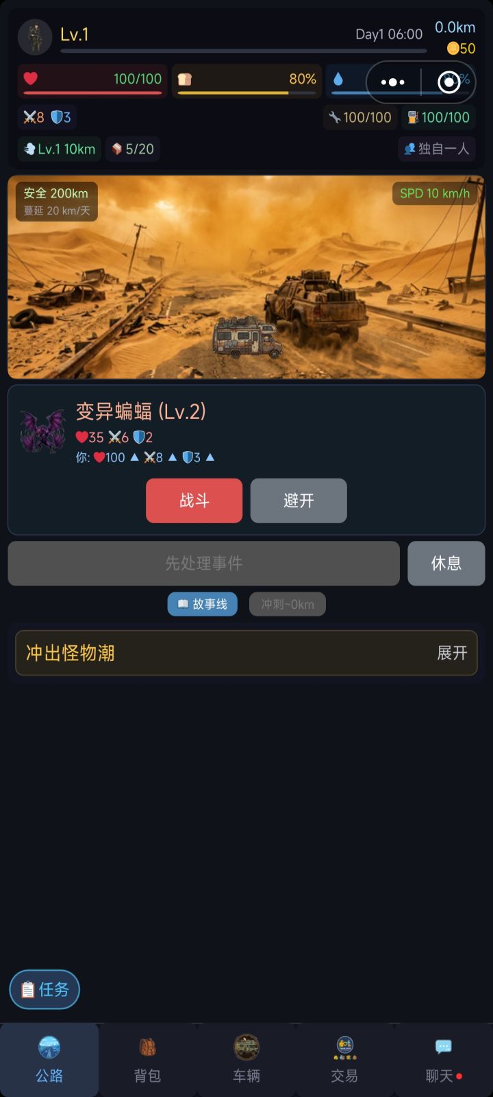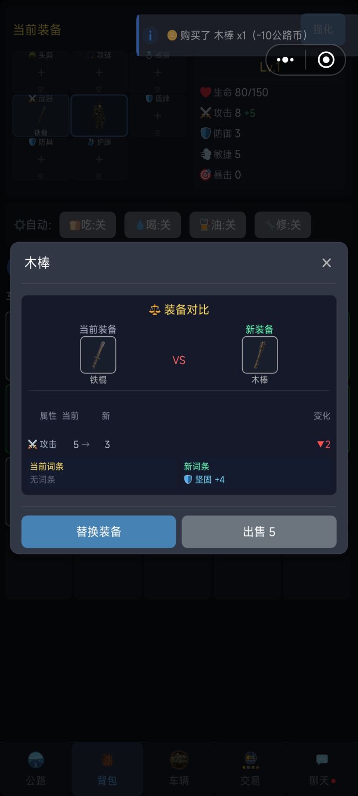 1.重写优化了部分UI的表达2.修复优化了随机事件的bug3.遇到怪物会有双方状态对比提示4.背包使用物品提示优化,可批量开箱5.新加最终boos,玩家行驶10W公里后遇到最终boos,打败即可通关,通关有轮回排行6.一些小细节的改动