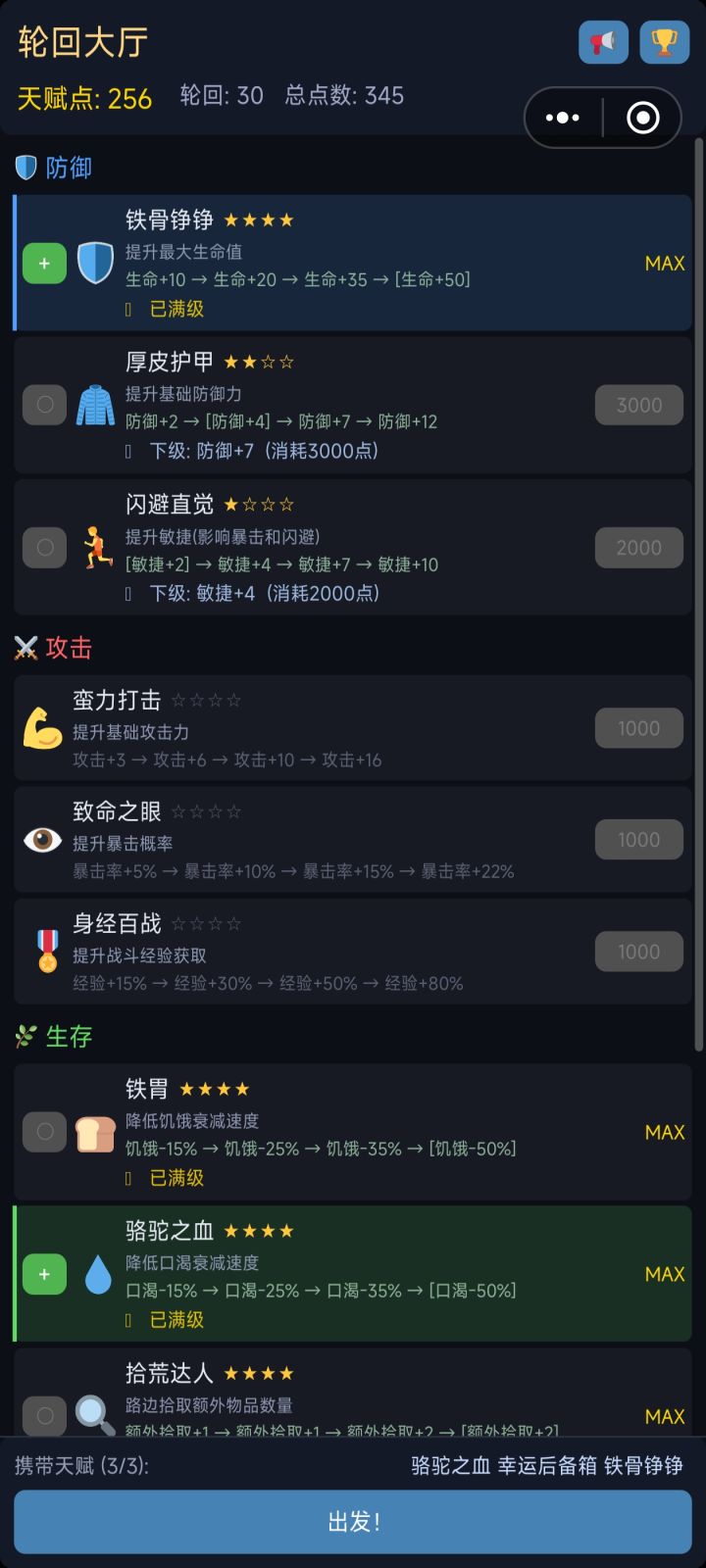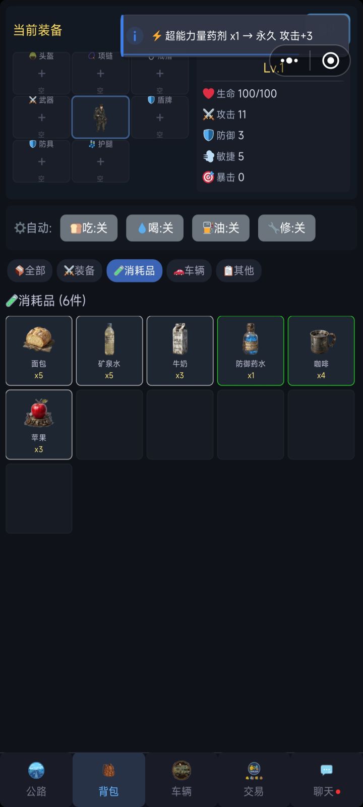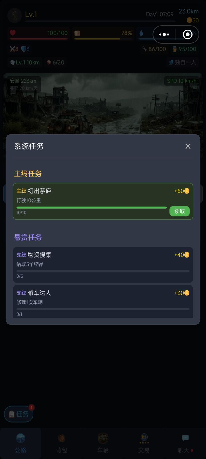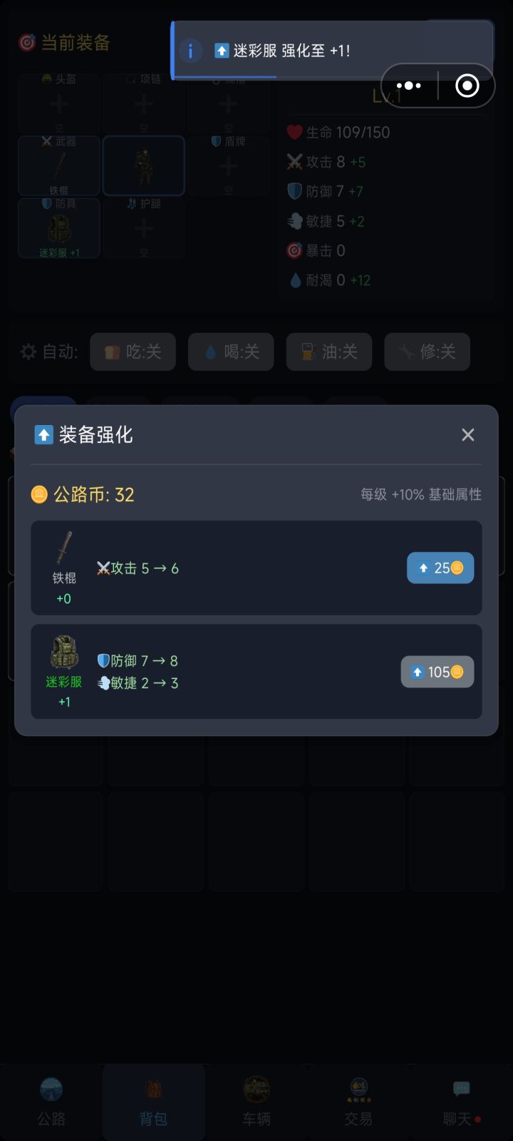 1.重写优化了部分UI的表达2.修复优化了随机事件的bug3.遇到怪物会有双方状态对比提示4.背包使用物品提示优化,可批量开箱5.新加最终boos,玩家行驶10W公里后遇到最终boos,打败即可通关,通关有轮回排行6.一些小细节的改动