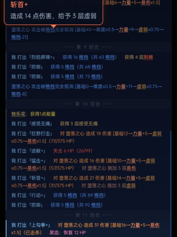 低难的数值相对简单,烧牌几张敲完仍随机不稳定难构成循环,但是其他数值够用,不建议攻哈输出推进斩杀,数值要求不够,靠虚弱和大量格挡的防哈熬易伤+爆发比较容易,但是盾击本身数值也两极化,一部分怪高攻叠不起来,一部分塞卡无视盾实际伤害也高。这边推荐旋风斩。一把93金,建议开局先sl一张能量牌携带再开游戏,升级还是以提升携带量优先,低质牌太多,另外本游的删卡费用比较友好,诅咒事件可以多碰碰,虽然遗物的收益