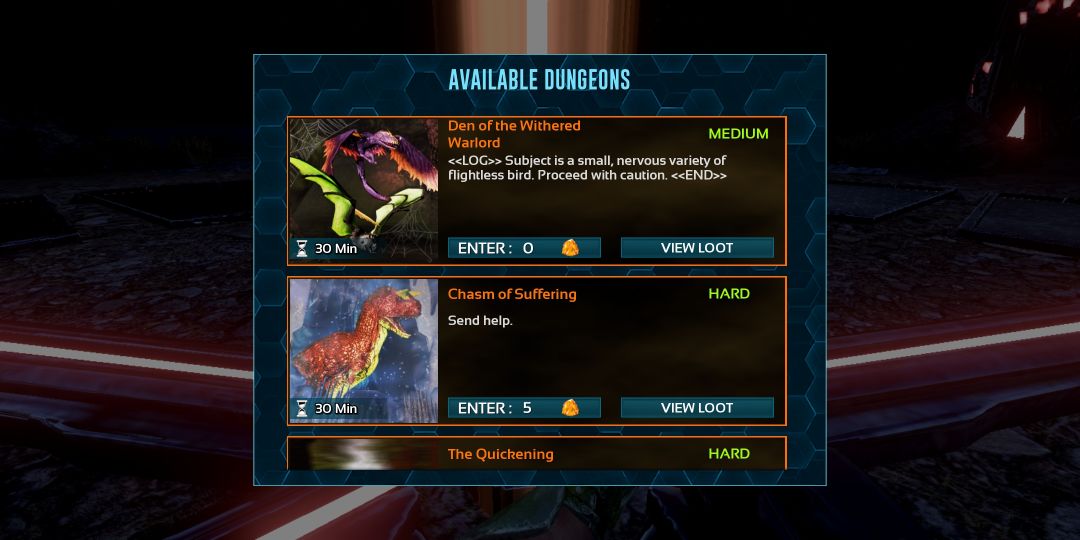 本期地牢和平生物: 1.渡渡鸟 2.似鸡龙 3.复栉龙 本期地牢泰克奖励: 1.泰克手套 2.泰克鞋子 3.泰克斜板 4.泰克霸王龙鞍 本期地牢Boss:星尾兽(困难模式7w血左右) 本期地牢物资携带推荐: 1.复合弓 2.传说剑 3.泵式霰弹槍 4.高品质铁甲1~2套 5.药酒 6.兴奋剂 本期地牢注意事项: 1.地牢不会自然回血 2.移速削减(也许是我的错觉?) 本期地牢击地图: 本期地牢怪物