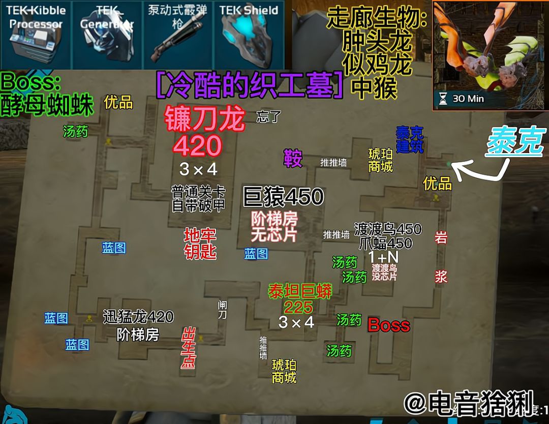 本期地牢主题:原始地牢 . 本期地牢泰克物品:泰克胸甲蓝图,泰克手雷蓝图,风神平台鞍蓝图,精良泰克古神鞍蓝图 . 本期地牢会出成品泰克鞍的宝箱已经全部标注 . 地牢地图: 本期怪物关卡攻略: . 1.骇鸟(满级):直接拿刀莽就行,轻轻松松~ . 2.阿根廷巨鹰(左下)(满级):本关一次刷一只,一共4波,拿复合弓游走拉满弓爆头,轻轻松松~泵式也可以~ . 3.爪蝠&渡渡鸟:本关需要优先击败渡渡鸟,再