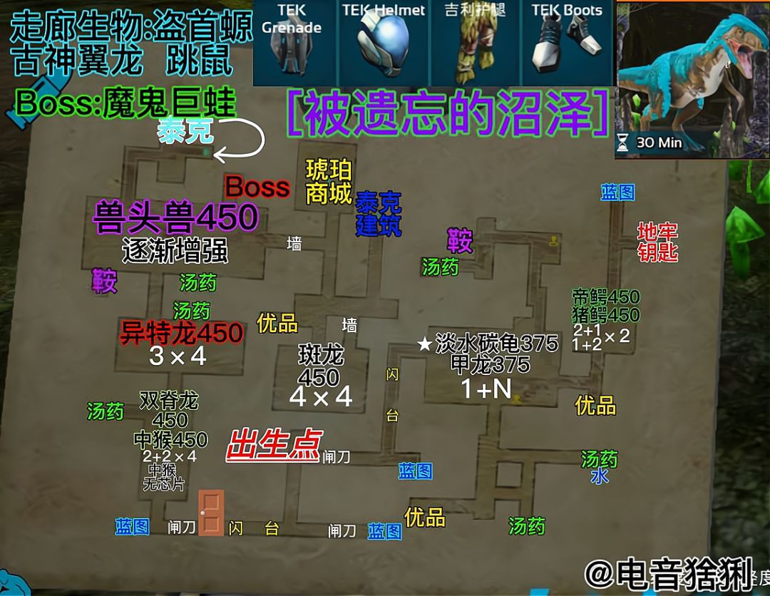 ---本期地牢主题---“沼泽地牢”--- . 本期泰克物品:泰克发电器蓝图,泰克休眠舱蓝图,泰克靴子蓝图,传说长管步枪蓝图,普通泰克护手蓝图 . 本期地牢BOSS:星尾兽 . 本期地牢地图: . 本期地牢怪物关卡攻略: 1.双脊龙(满级):可以用平底锅打晕,随意蹂躏! . 2.猪鳄&帝鳄(满级):本关需要优先击败猪鳄,用平底锅敲晕猪鳄打掉,然后再用泵式游走,击败帝鳄~ . 3.三角龙(满级):这