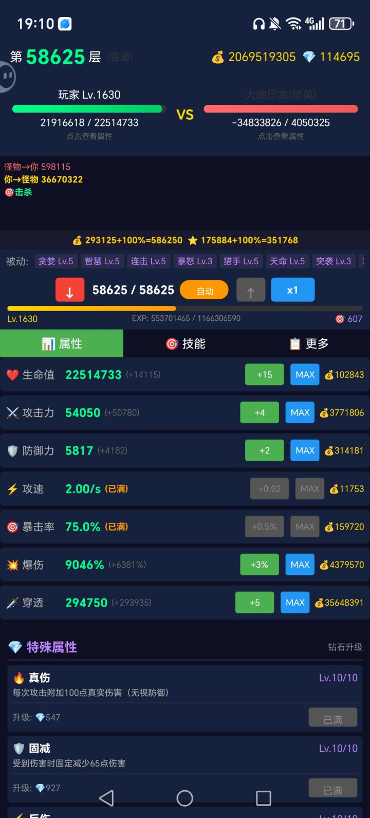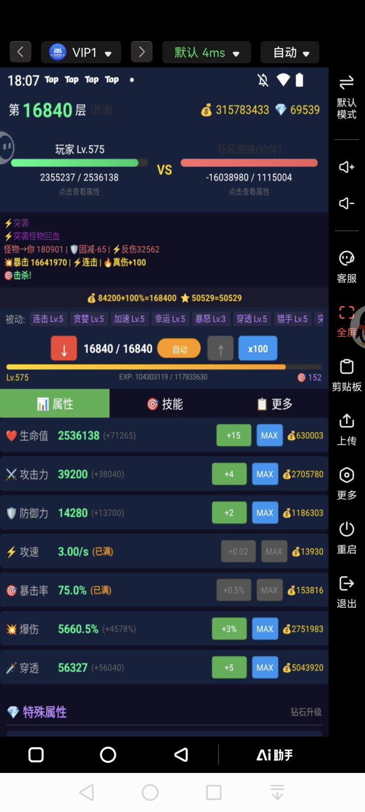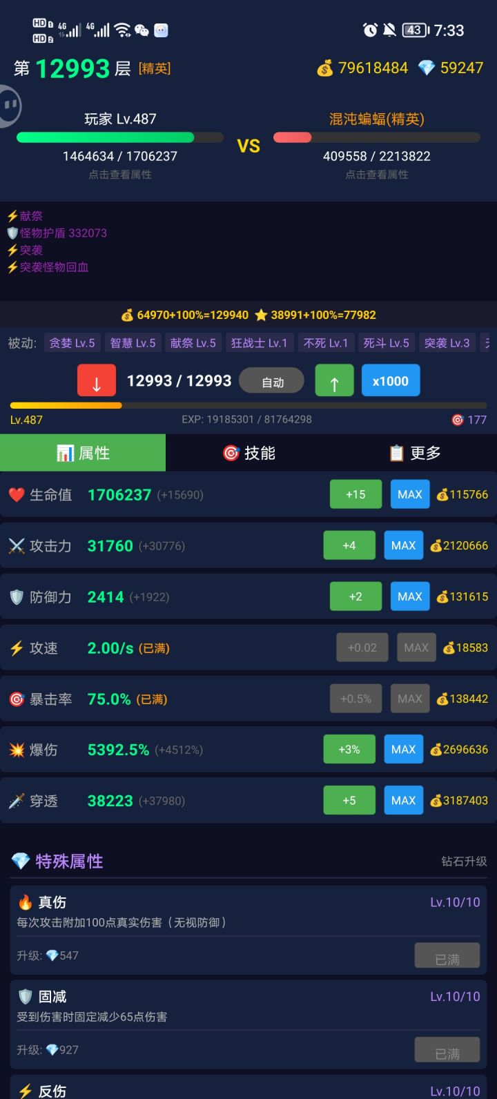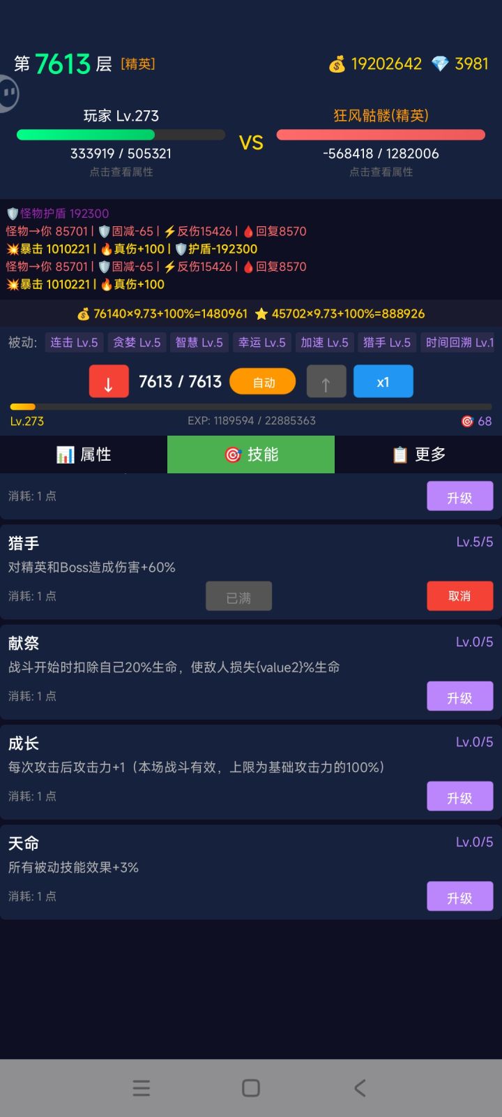 bug:非自动也会自己往后推。还有1w层后占用有点多,感觉变卡了不少。百分比类数值不太正常。还有挂机推塔可以无限增长,我这个号只玩了几个小时,后期推得太慢了,因为没有卡关。连击体系不适配,部分技能过于幽默。其他还好。