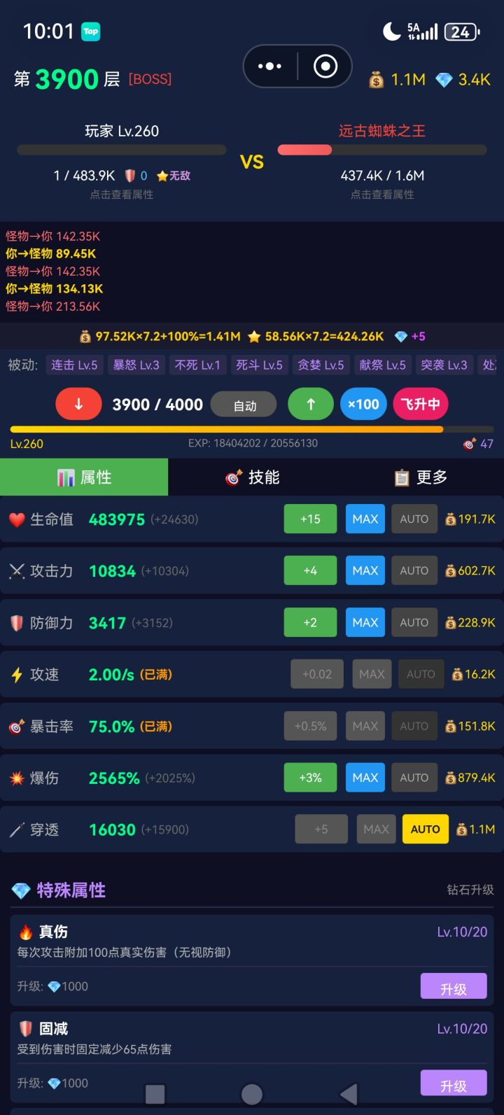 这个版本的重生机制尚可。总共转生了16次,每次转生会有基础数值和百分比自选。前面的重生会稍微难渡过一点,后面一般都比较顺利。天赋:经验、金币、暴击爆伤、不死两件套、压血线两件套、50攻击(顺序比较固定)加点:优先暴击,随后点一部分爆伤,确保有效爆伤>1000%。其他点穿透(穿透在溢出1000左右达到最佳效果,可能是bug)。生命值和防御力在前一百级是有用的,但是不点。攻击力、攻速在升级最大费