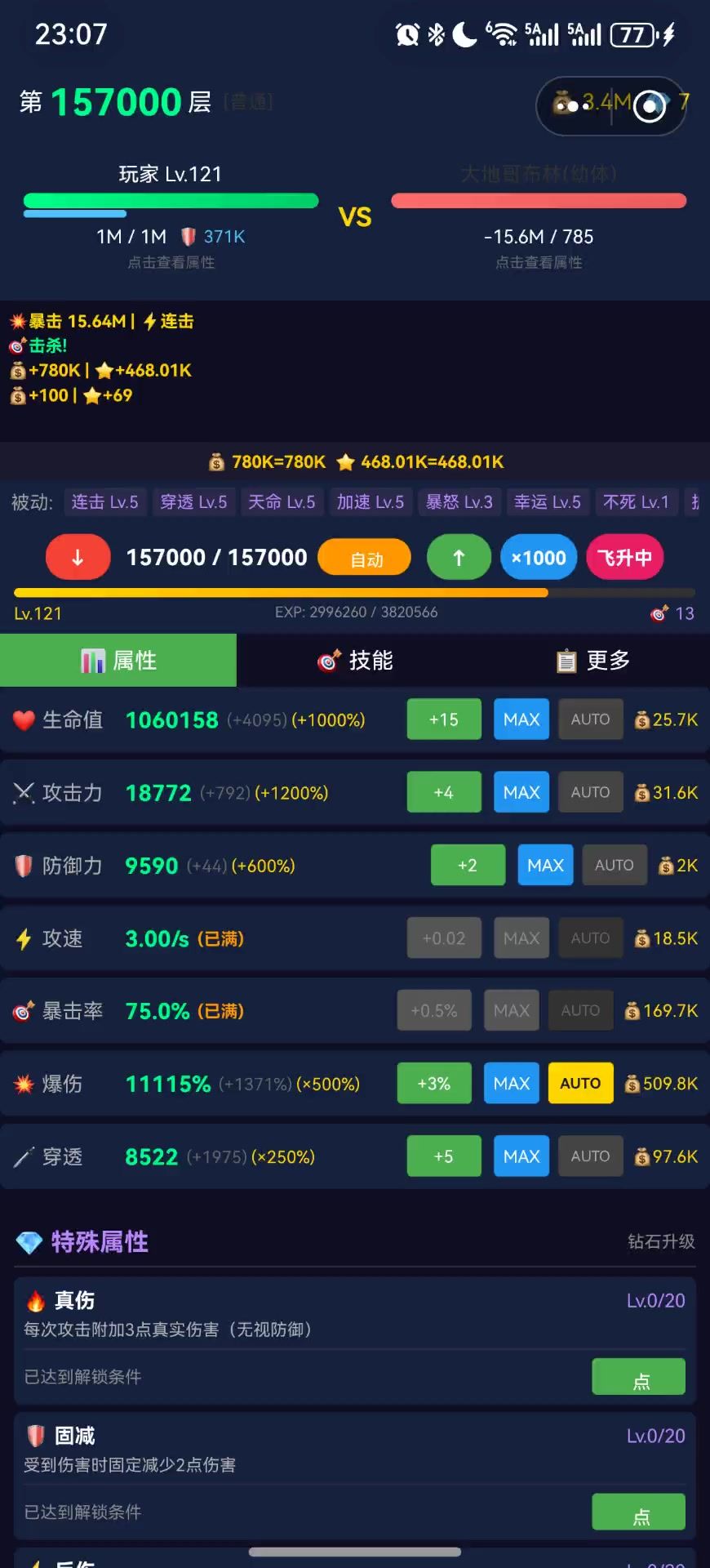 这个版本的重生机制尚可。总共转生了16次,每次转生会有基础数值和百分比自选。前面的重生会稍微难渡过一点,后面一般都比较顺利。天赋:经验、金币、暴击爆伤、不死两件套、压血线两件套、50攻击(顺序比较固定)加点:优先暴击,随后点一部分爆伤,确保有效爆伤>1000%。其他点穿透(穿透在溢出1000左右达到最佳效果,可能是bug)。生命值和防御力在前一百级是有用的,但是不点。攻击力、攻速在升级最大费