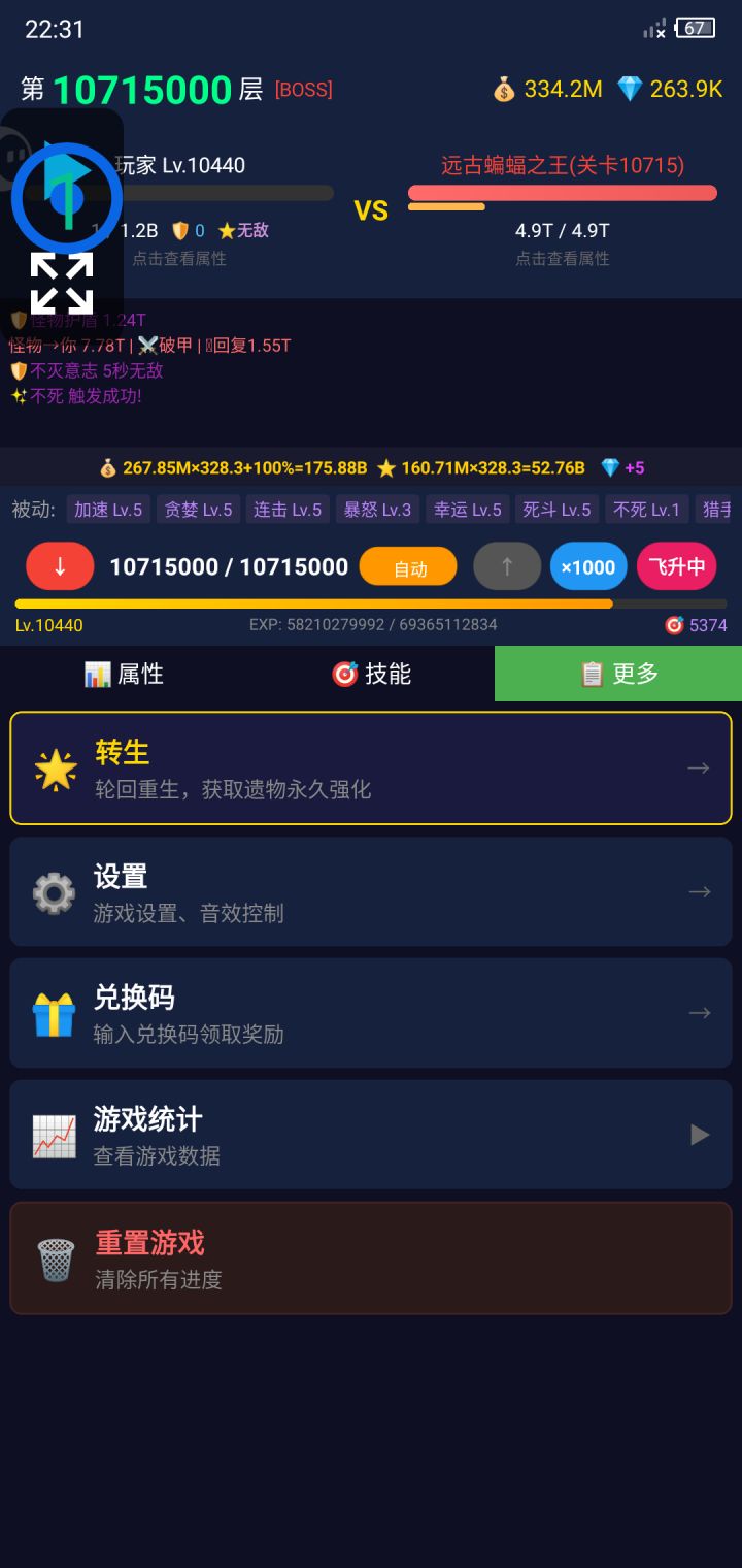 10w层一跳没有实装。怪物的超高攻速何意味钻石系统还是何意味装备没有清理的方案。建议每系自动保留最好的。(重要!!!目前装备已经2000多件了,一直增长肯定是不行的)吞噬系统的自动与max。当前版本切换加点会很卡,推测是加点采用的是循环而不是公式,加点相关的计算最好简洁,避免循环。爆伤、穿透的百分比(转生加成)不显示,但实际是生效的。新版本还可以