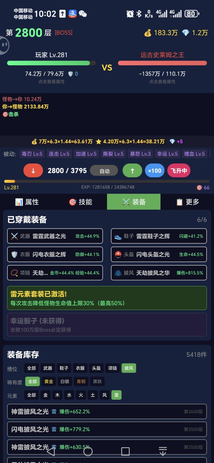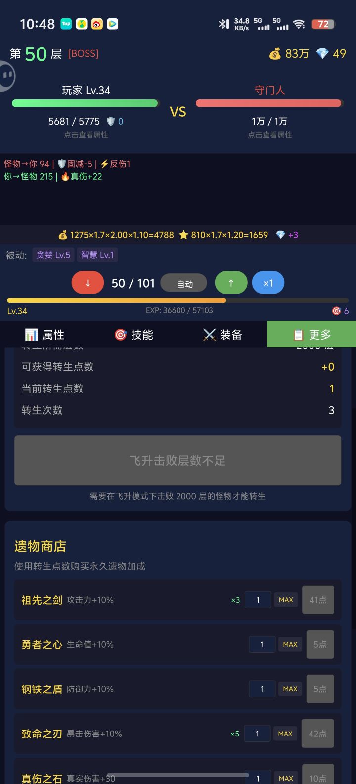 10w层一跳没有实装。怪物的超高攻速何意味钻石系统还是何意味装备没有清理的方案。建议每系自动保留最好的。(重要!!!目前装备已经2000多件了,一直增长肯定是不行的)吞噬系统的自动与max。当前版本切换加点会很卡,推测是加点采用的是循环而不是公式,加点相关的计算最好简洁,避免循环。爆伤、穿透的百分比(转生加成)不显示,但实际是生效的。新版本还可以