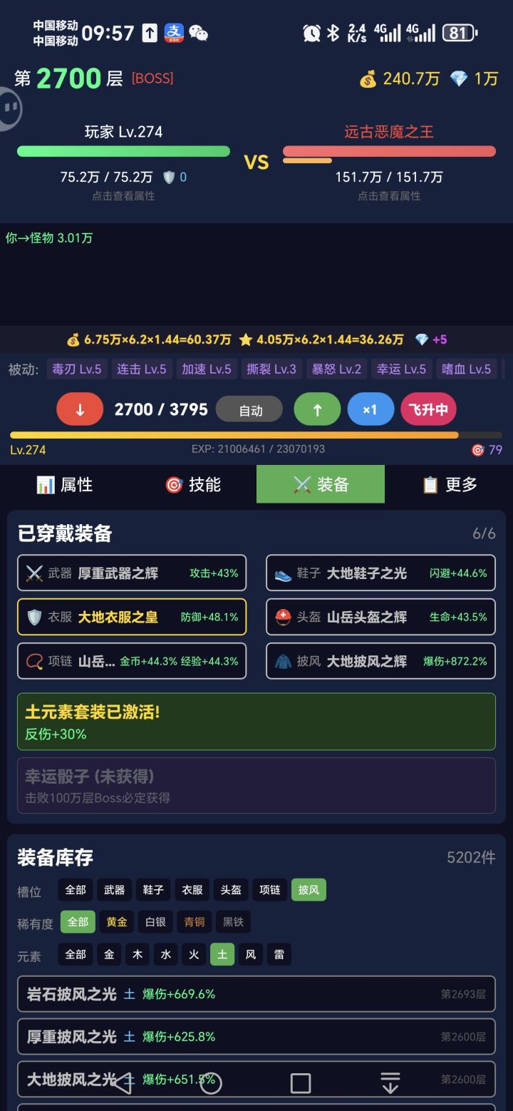 在线通关, 卡关了就刷一下BOSS,几乎能无限通关。破甲够,这暴击伤害,一刀一个怪。
