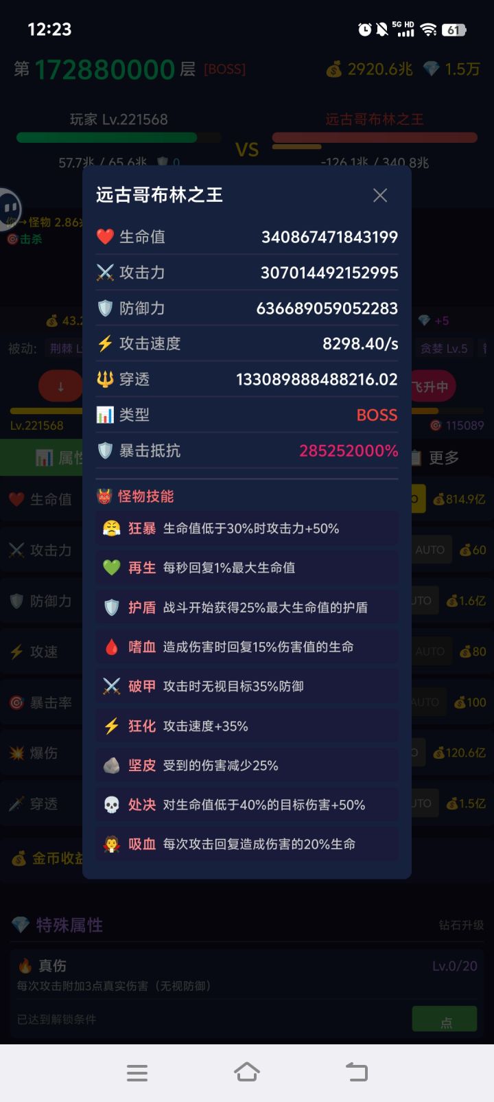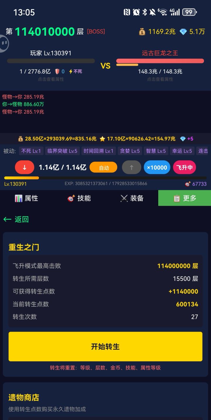 10w层一跳没有实装。怪物的超高攻速何意味钻石系统还是何意味装备没有清理的方案。建议每系自动保留最好的。(重要!!!目前装备已经2000多件了,一直增长肯定是不行的)吞噬系统的自动与max。当前版本切换加点会很卡,推测是加点采用的是循环而不是公式,加点相关的计算最好简洁,避免循环。爆伤、穿透的百分比(转生加成)不显示,但实际是生效的。新版本还可以