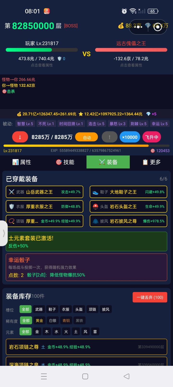 10w层一跳没有实装。怪物的超高攻速何意味钻石系统还是何意味装备没有清理的方案。建议每系自动保留最好的。(重要!!!目前装备已经2000多件了,一直增长肯定是不行的)吞噬系统的自动与max。当前版本切换加点会很卡,推测是加点采用的是循环而不是公式,加点相关的计算最好简洁,避免循环。爆伤、穿透的百分比(转生加成)不显示,但实际是生效的。新版本还可以
