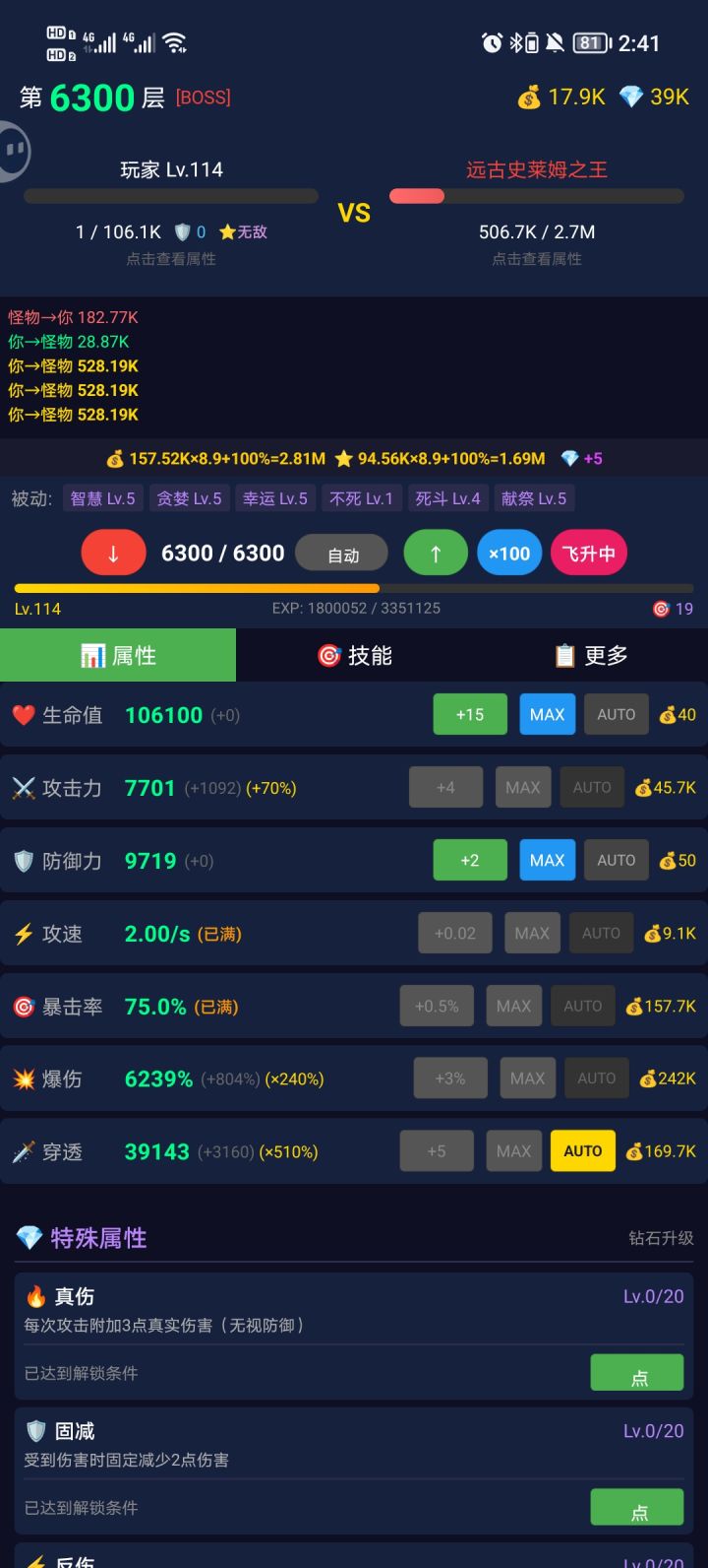 这个版本的重生机制尚可。总共转生了16次,每次转生会有基础数值和百分比自选。前面的重生会稍微难渡过一点,后面一般都比较顺利。天赋:经验、金币、暴击爆伤、不死两件套、压血线两件套、50攻击(顺序比较固定)加点:优先暴击,随后点一部分爆伤,确保有效爆伤>1000%。其他点穿透(穿透在溢出1000左右达到最佳效果,可能是bug)。生命值和防御力在前一百级是有用的,但是不点。攻击力、攻速在升级最大费