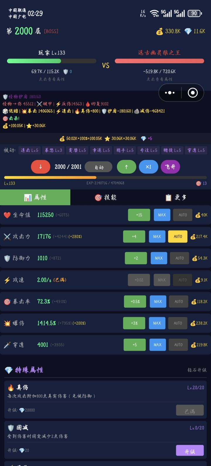在线通关, 卡关了就刷一下BOSS,几乎能无限通关。破甲够,这暴击伤害,一刀一个怪。