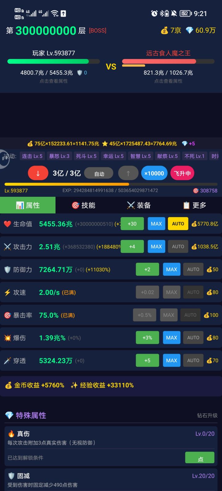 反伤流,0转生的极限就是9999,得转生加生命值,1转后可以推到一百多万层,接着2转,极限大约在五百多万层,最后3转直接可以无脑推了,吞噬点全部加生命