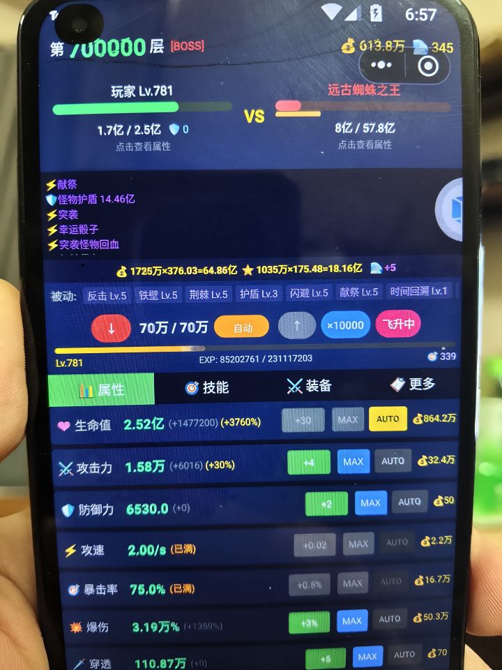 因为之前装备卡住14000多件,重新玩了3天,第一次没转生突破1万层挂机了2天。昨天下午开始转生今天就突破1000万层了。现在发现前期应该是加攻击*暴击超两亿以后就点穿透,点技能天命(有机会一项属性翻倍),前几次转生我一直点的穿透之石。然后今天玩的时候,后面20万层开始就开始奇怪了,只要点技能不死+荆棘+献祭+突袭就开始突突升层
