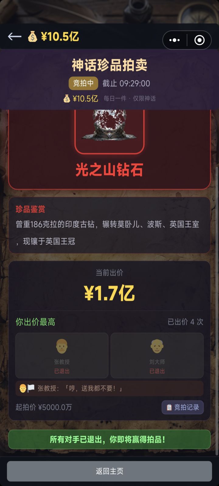 挖宝的形式很有刺激感,基本出一个大红就可以一波肥了。拍卖模式还没太搞懂,显示我已经拍下了,但是没到我仓库里。