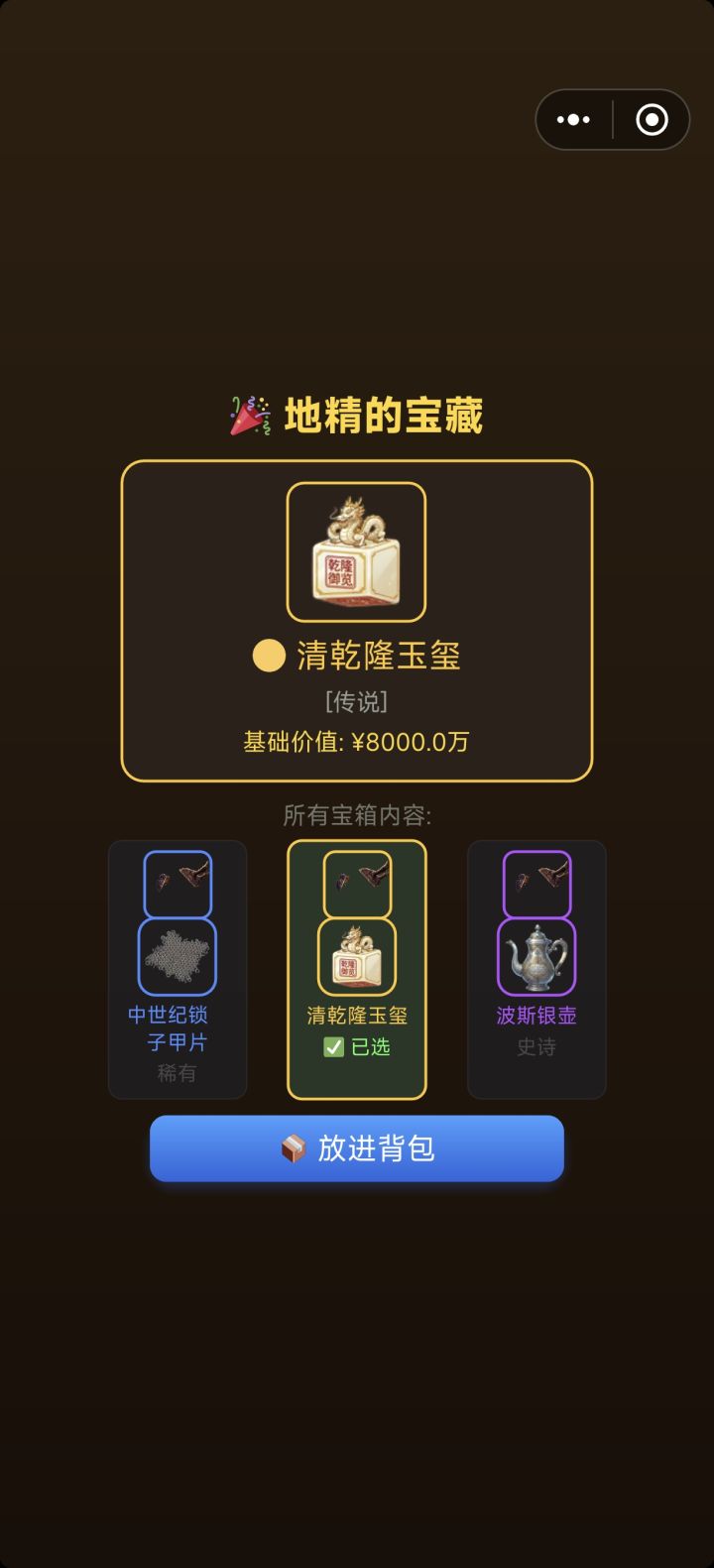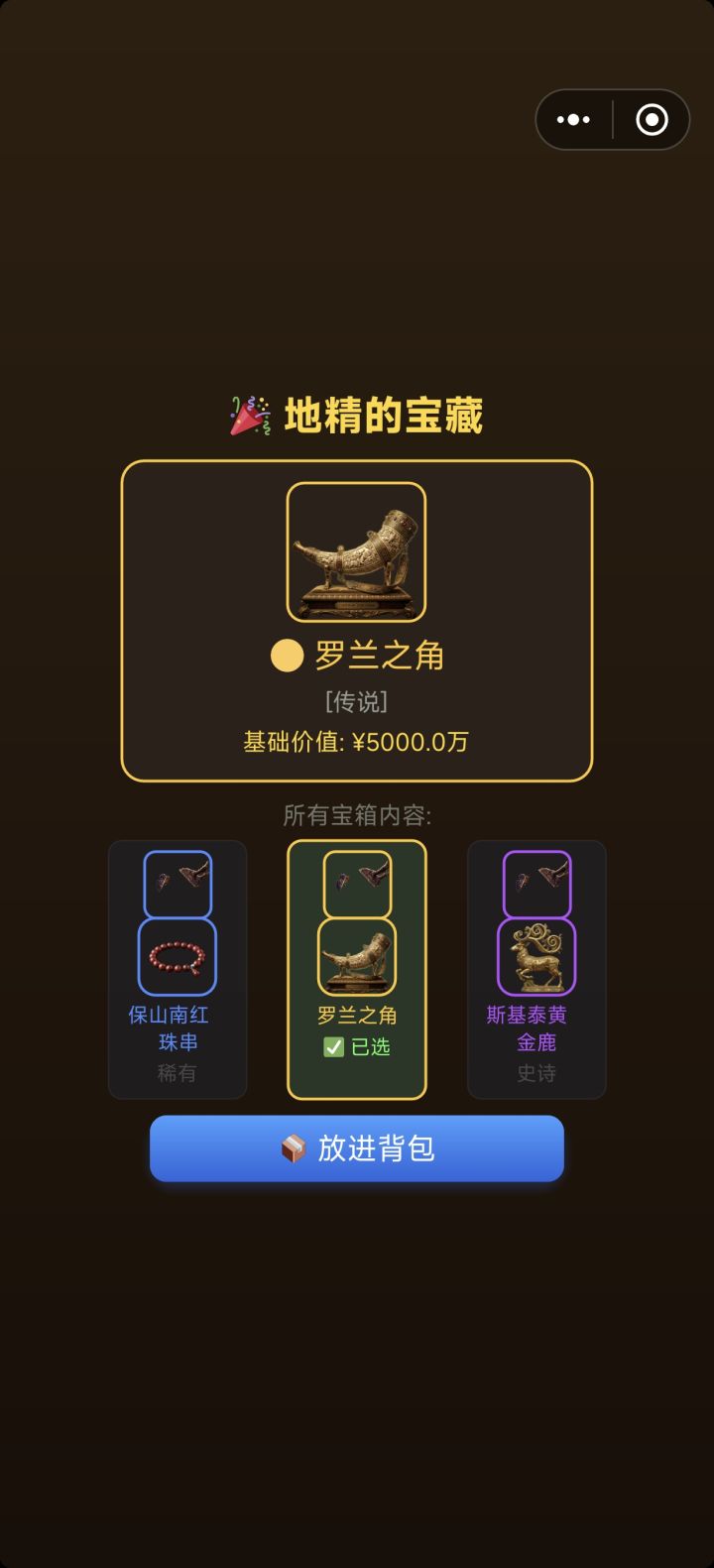 💡游戏创意:主要是挖宝,在不同的地域挖宝获得宝物,随后高价卖出,各种属性可通过升级来提升概率,主要是修复宝物概率,挖宝出货概率,以及献祭物品出货,献祭紫色物品保底就出红,非常nice,强烈推荐新友入坑!
