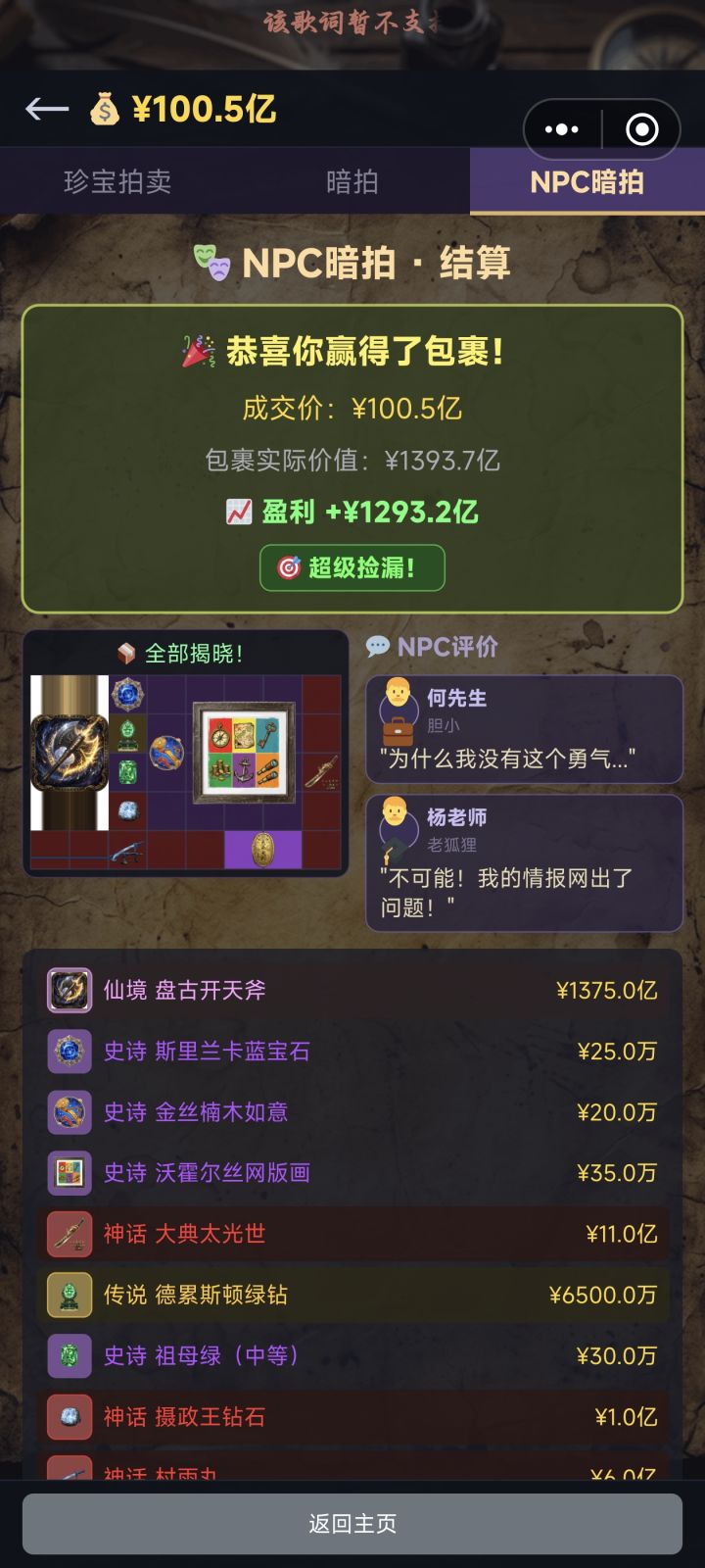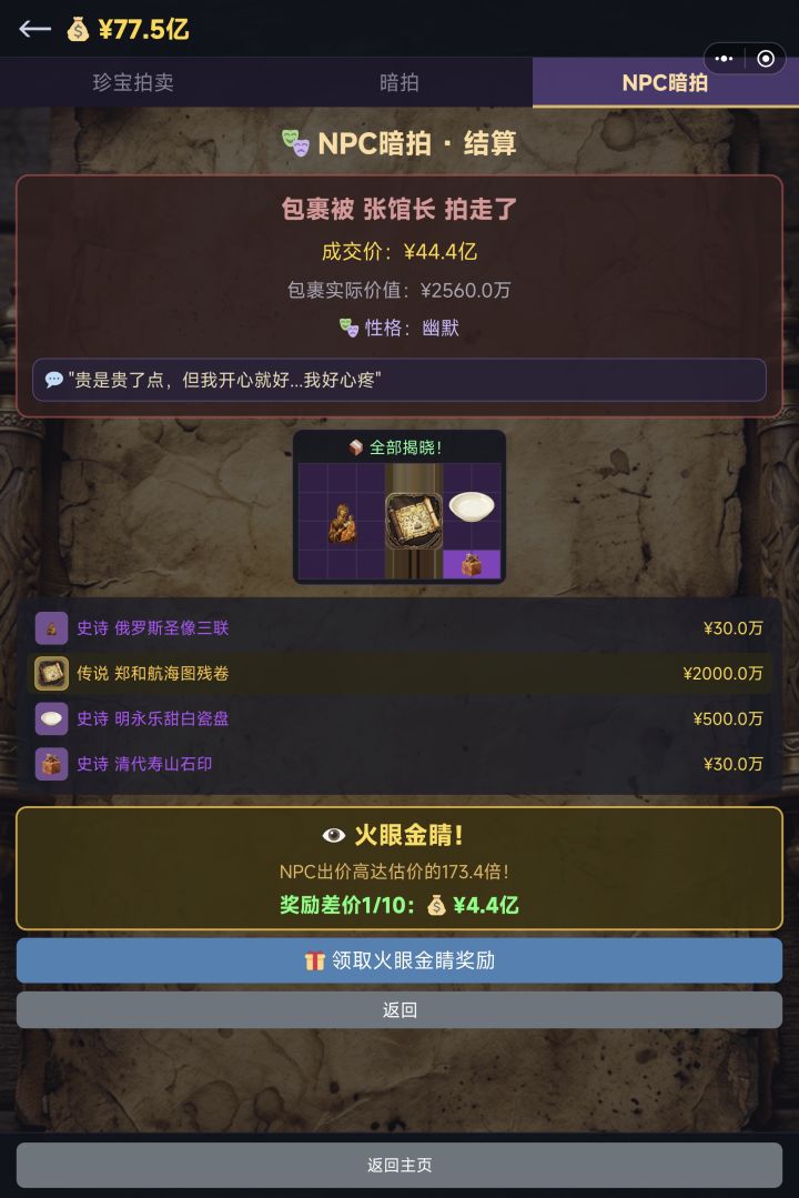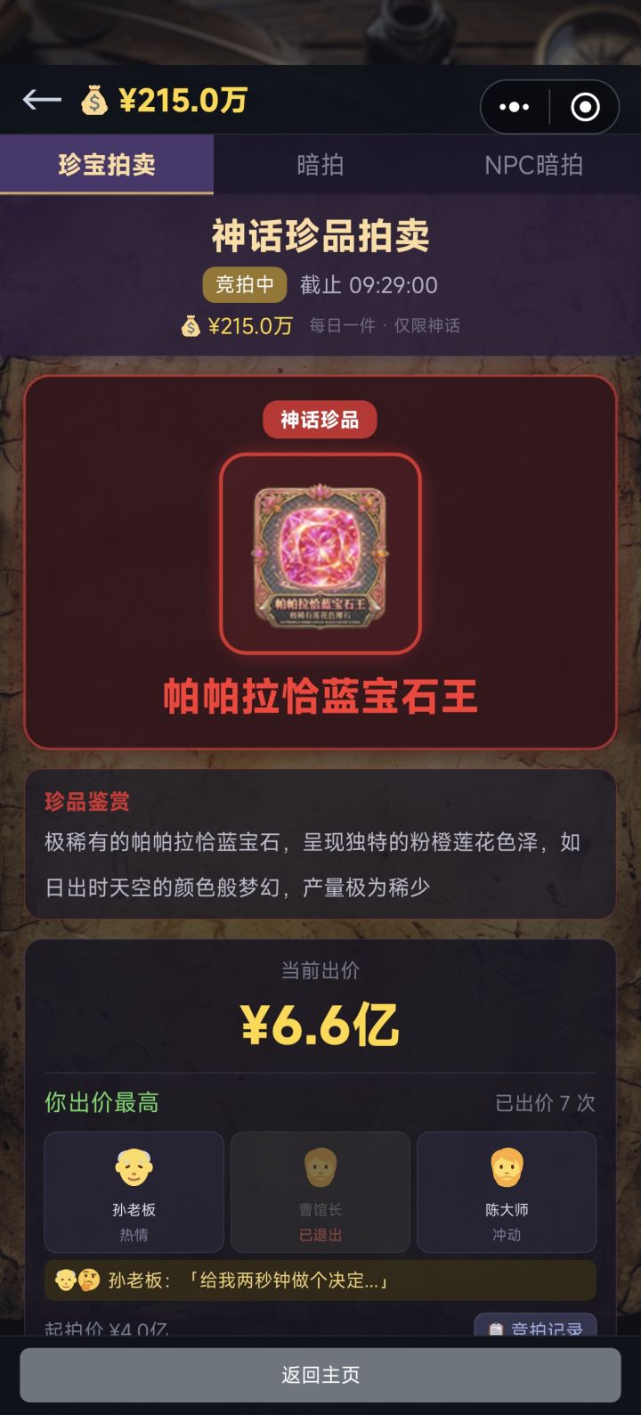 1.每日每人额度500亿,次日刷新2.进入一个三轮九次报价暗盒拍卖3.以实际拍得估值的10%,作为收入