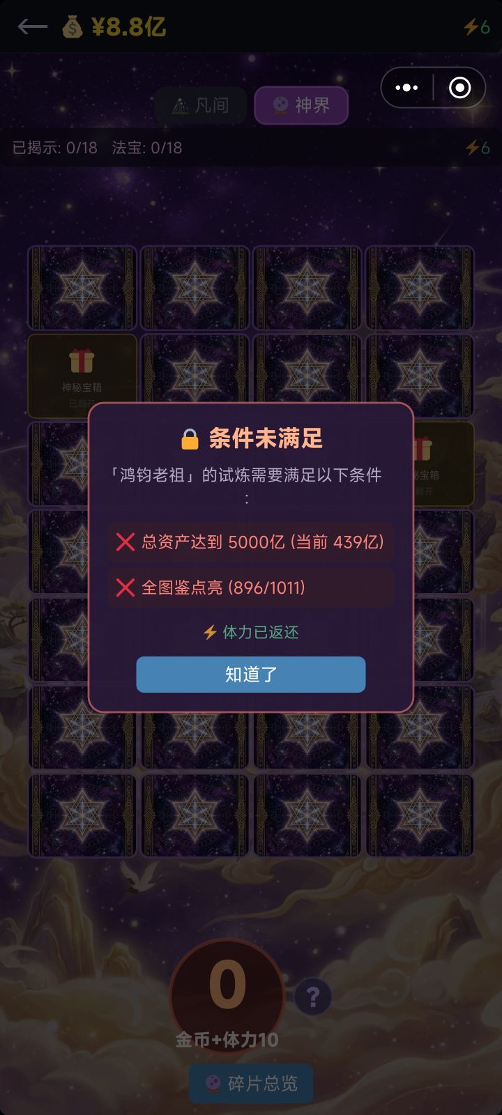 晚上刚刷到这个神祇的要求,觉得太难完成了叭……现在资产连这十分之一都还不到。PS: 制作人,能不能申请降低一下小游戏难度?或者,可以出个选项,用十分之一背包钱钱直接赢游戏什么的?那些游戏都太难啦~