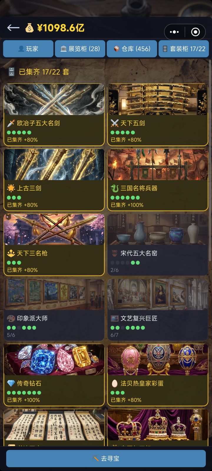 1一直有人反馈的套装标识更新2家里的仓库更新了一键鉴定和一键修复。3增加了挖掘整理背包的一键整理功能。应该能解决大部分情况整理不流畅或者触摸失效的问题。但是闪退问题目前解决不了。4靠钻漏洞刷钱上排行榜的,以后会被优化掉。5之前成就分是会波动的,因为有些成就,是根据当前的金币和当前的套装数量统计的。现在已改成固定了,只要点亮以后,就不会消失了。