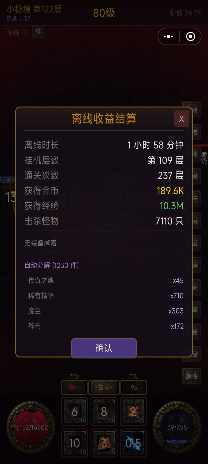 1 大秘境连续推进 大秘境通关后不再强制返回小秘境,可消耗钥匙继续挑战下一层 支持锁定层数反复刷同一层大秘境(每层仍消耗1把钥匙) 钥匙耗尽时自动返回小秘境右侧导航栏在大秘境中变为「返回」按钮,点击后需确认,防止误触2 巅峰属性加点现已支持免费重置,已分配的点数将全部返还3 药水价格下调生命药水/法力药水价格由 2000 金币降至 500 金币新增一次购买 10 瓶的批量选项(50