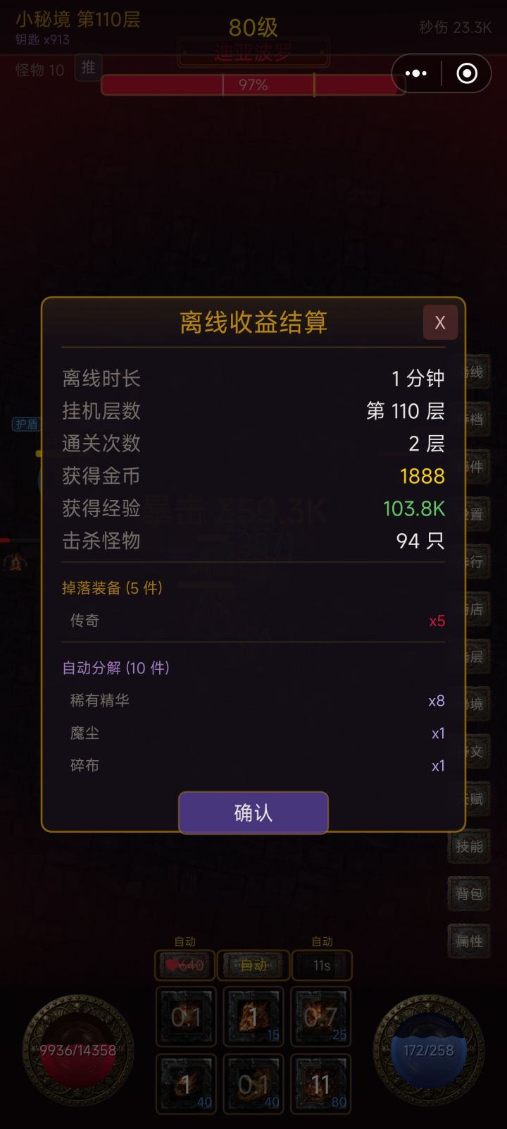 1 大秘境连续推进 大秘境通关后不再强制返回小秘境,可消耗钥匙继续挑战下一层 支持锁定层数反复刷同一层大秘境(每层仍消耗1把钥匙) 钥匙耗尽时自动返回小秘境右侧导航栏在大秘境中变为「返回」按钮,点击后需确认,防止误触2 巅峰属性加点现已支持免费重置,已分配的点数将全部返还3 药水价格下调生命药水/法力药水价格由 2000 金币降至 500 金币新增一次购买 10 瓶的批量选项(50