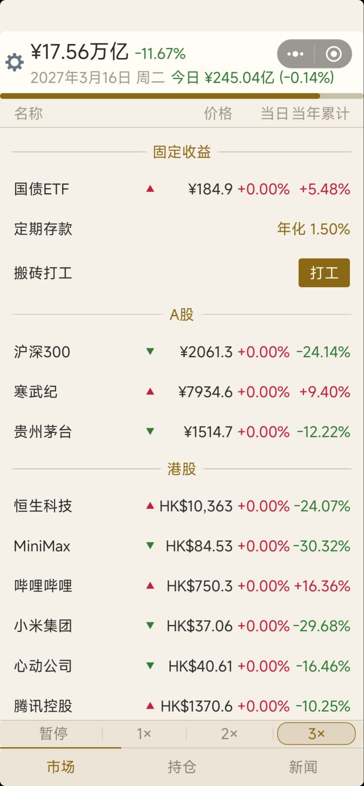 本游戏全部拉取了从2025年1月-2026年3月的主流投资标的的真实数据实现投资模拟,同时支持最高100倍的杠杆借贷,来试试在真实经历过这一切之后,回到25年初,你的投资收益能有多少吧。2026年3月后进入幻想模式,数据基于AI模拟结合新闻系统进行生成。