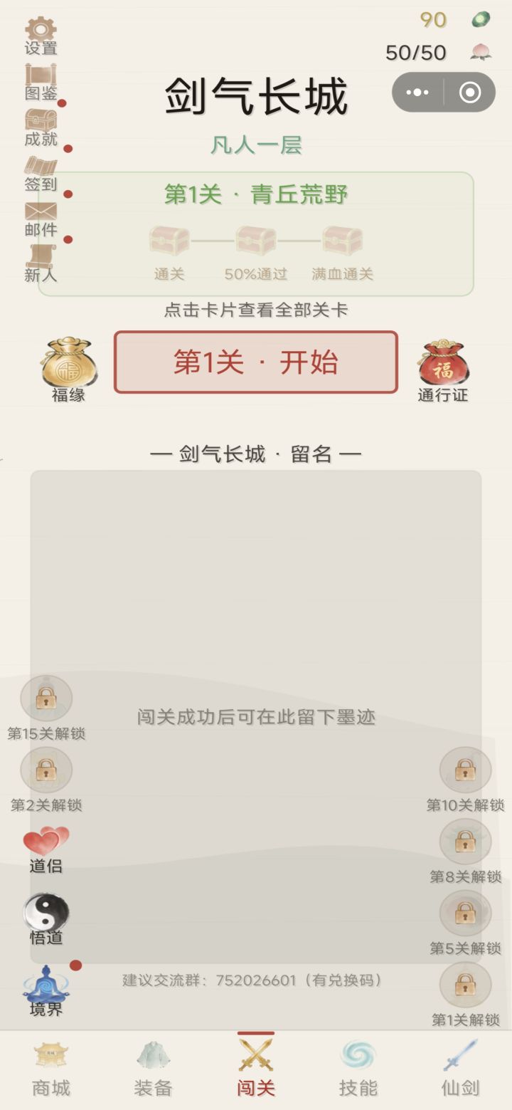 更新日志新增技能碎片掉落新增技能升级系统新增背包系统,完善背包信息查看离线奖励弹窗、关卡详情弹窗增加武器碎片图标奖励图标布局改为 6 个一排、2 排显示商城福利档第一项:看视频领取灵石×200 → 看视频领取龙晶玉×10法相楼法缘值存档丢失(看3次广告后重进归零) #剑气长城