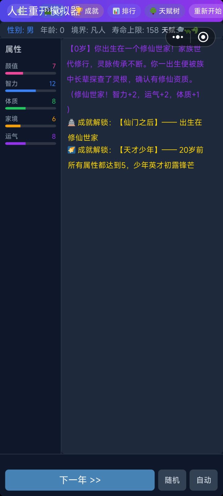 说实话,这种类型游戏做成这样已经非常好了,长期玩这种人生类,穿越类的我来说,没有任何花里胡哨,改的每一个点,从最初的乱码,天赋少,剧情单一,到现在逐渐的全面并且丰富,真的非常推荐玩