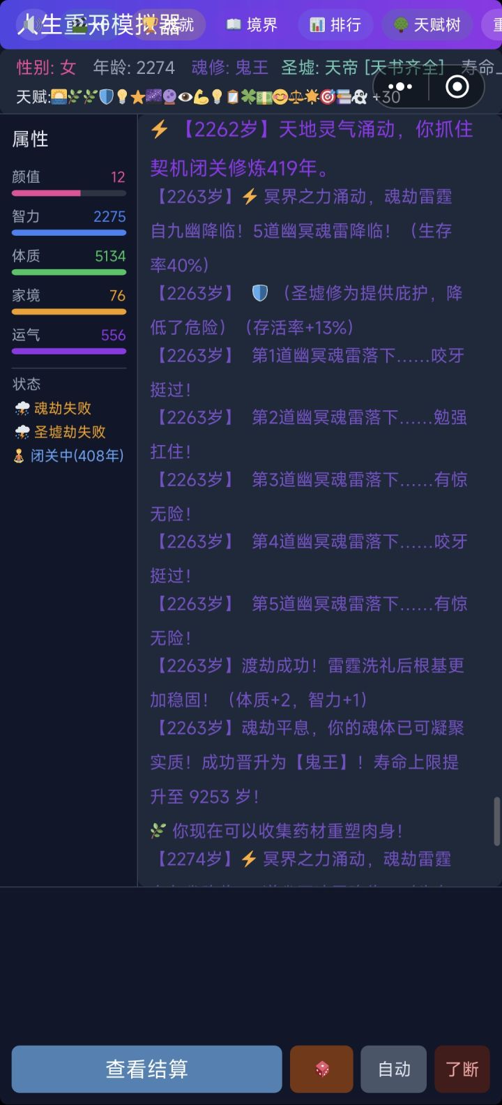 后边就是一直渡劫失败,修为减半,最后10%成功率的鬼道雷劫都过了,无缝衔接下一个雷劫,直接给我劈死了,这40概率没成算我运气不好