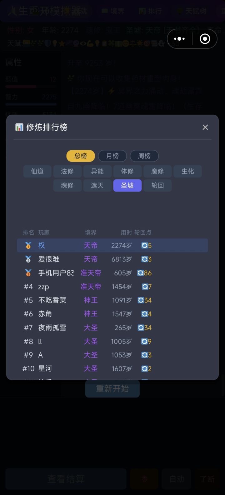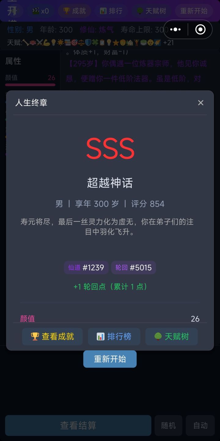 首玩体验:开局直接活到几千年,死亡后触发鬼修路线,达成条件可重塑肉身,玩法惊喜感拉满。二次死亡未走鬼修,选择直接转世。整体内容丰富度不错,核心槽点是修炼过程耗时过长,无法跳过时间,后期节奏偏拖沓。