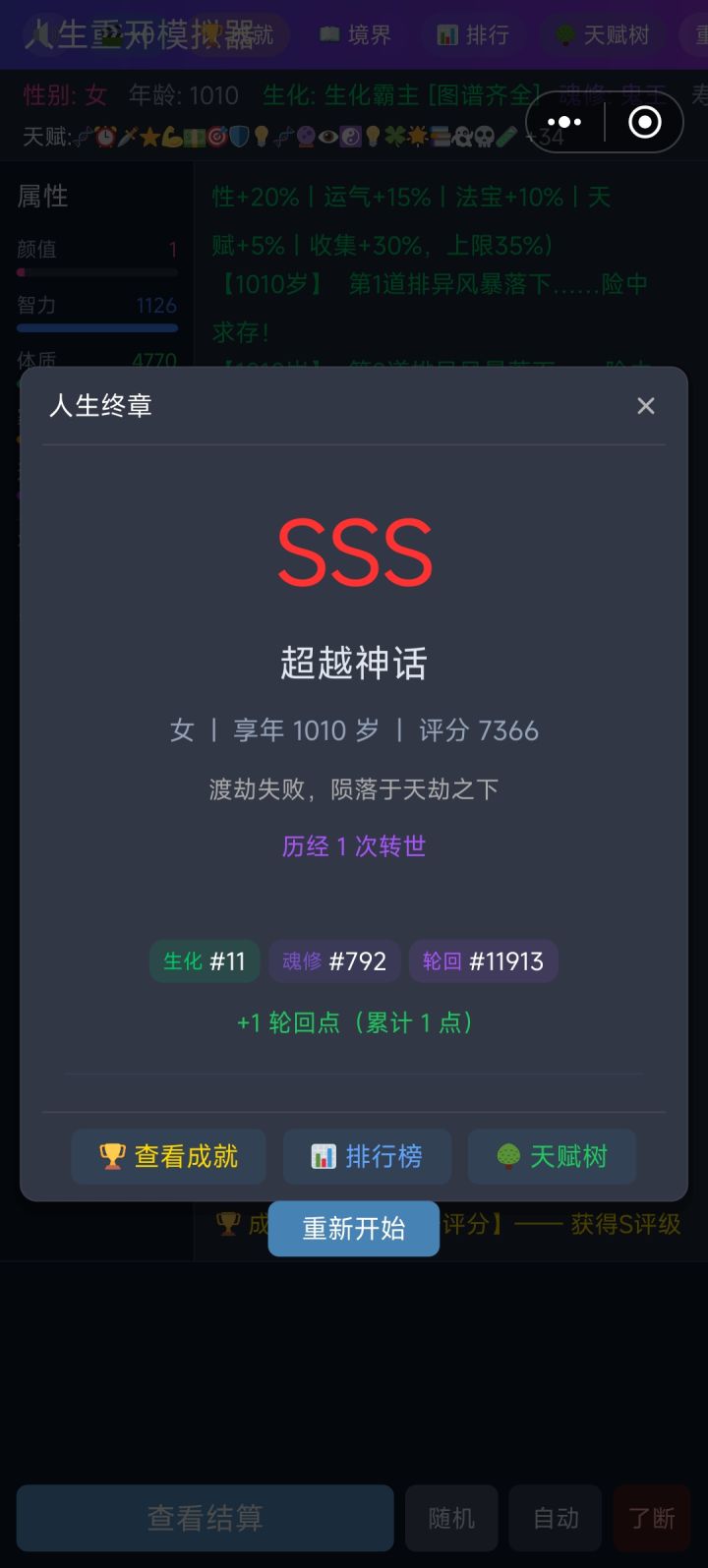 太舒服了,第一次玩就拿了个SSS,开局选天赋的时候拿了个远古血脉,后期一直拿后天天赋