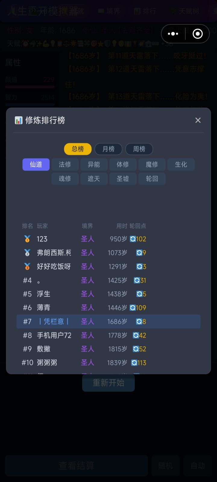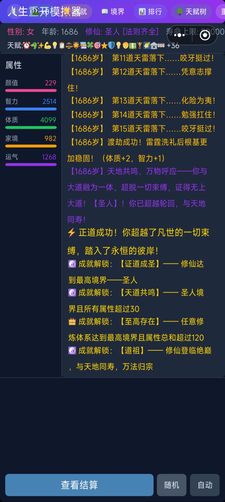 只要突破筑基,后面就是一路绿灯,五百岁到合体,然后又卡了一段时间领悟法则,不过还是满法则通过。刚玩这个游戏没几次,玩完了才发现还能升级技能,啧……还能优化