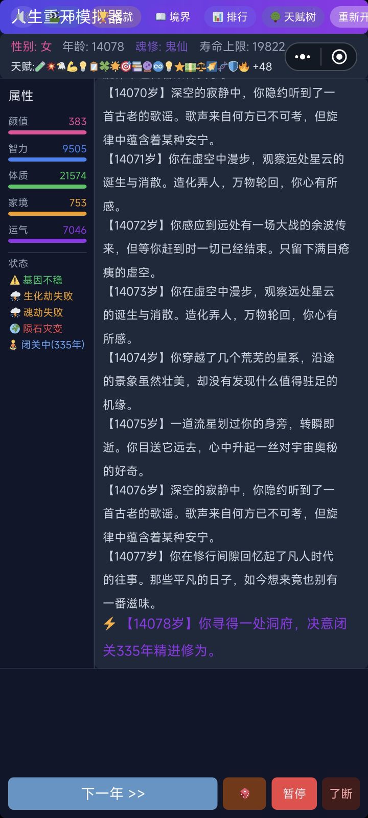 估计是卡上bug了,重活了好多次了,然后一到轮回之主就自动掉等级(岁数不掉)就导致鬼仙状态19822年的寿命