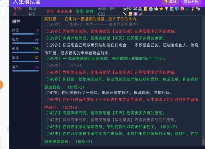 增加了更多的事件,末日,异界,废土,虫族,外星人入侵等等多个,请大家尽情探索,增加了天赋,以及更多成就系统,后天系统,可以触发多种修炼体系