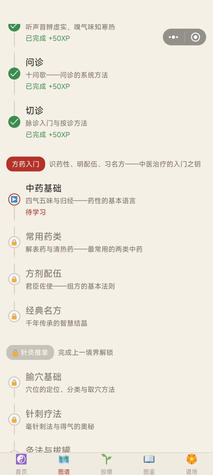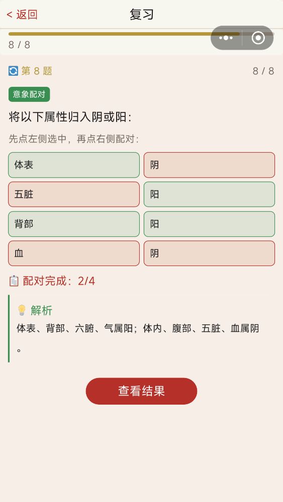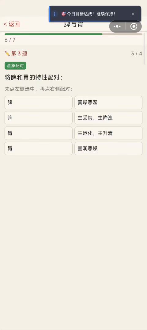 每天一位虚拟患者登门求诊,等你望闻问切、辨证施治。每日随机呈现一则临床病例,含主诉、症状、舌象、脉象四选一辨证,选出你认为的正确证型答后即出详细解析,帮你理清辨证思路答对 +30 XP,答错也有 +15 XP 鼓励分累计统计你的诊断次数与正确率首批收录 15 个经典证型:风寒感冒、风热感冒、肝气郁结、脾胃虚弱、肾阳虚、气滞血瘀、阴虚火旺等,覆盖中医入门核心知识。打开首页,找到"每日一