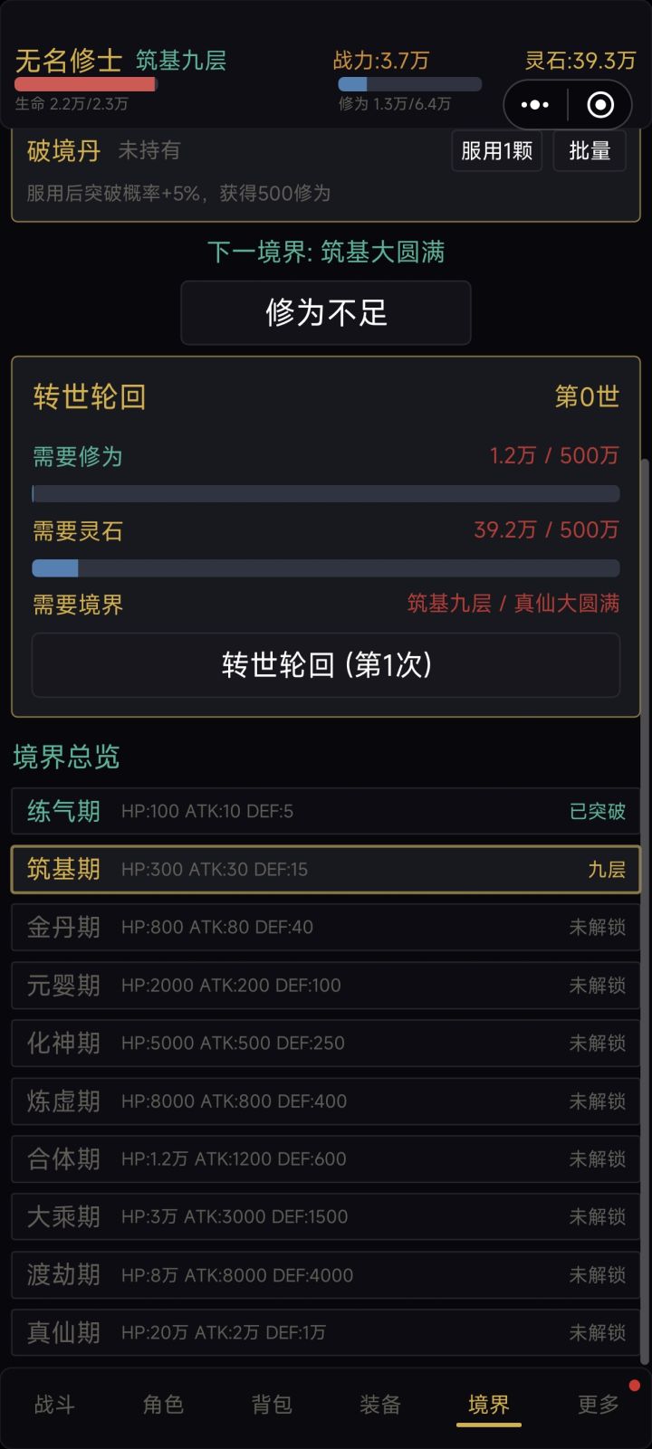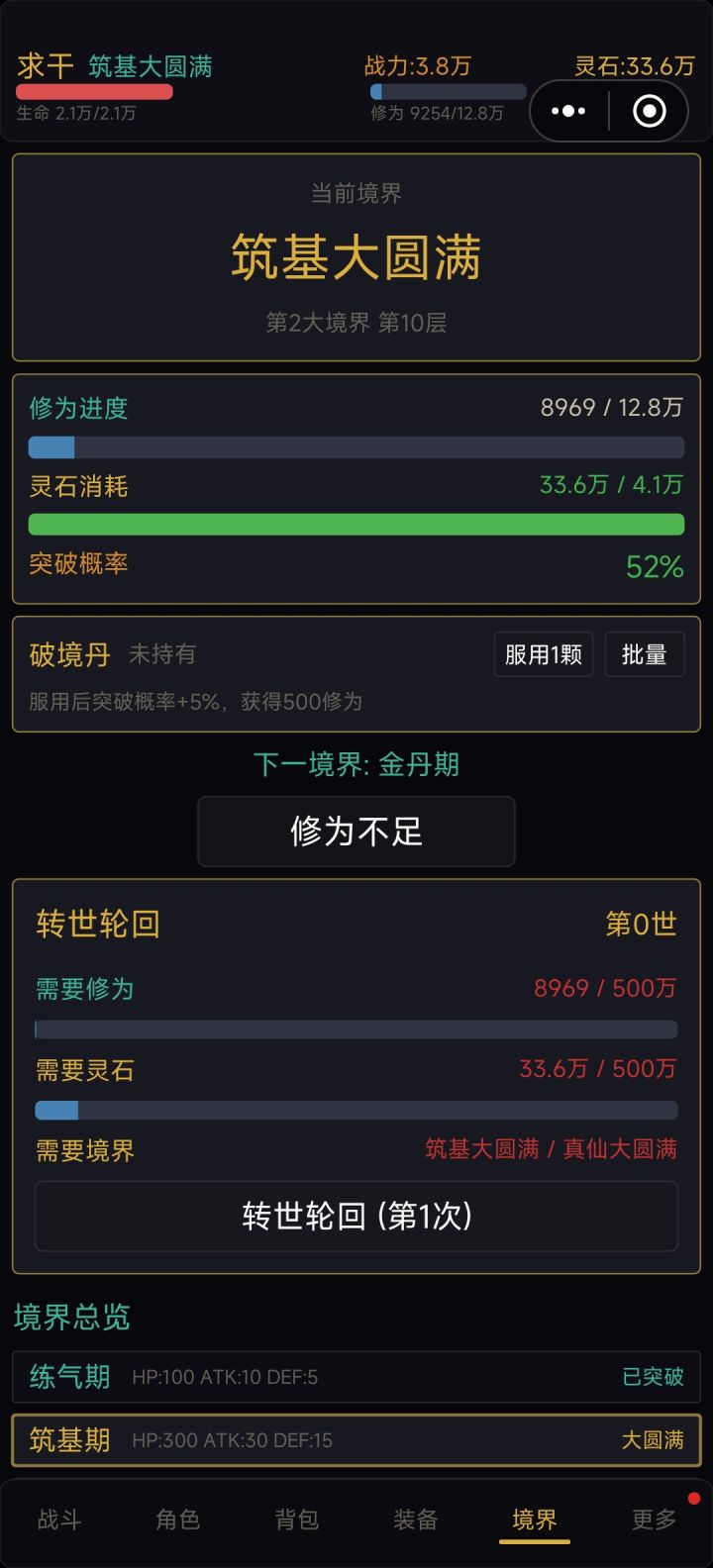 不管大境界还是小境界 升一级怪只加5点修为 大乘期一个怪才300修为 还没有2倍速 筑基期 突破就只有50几的成功率,破镜丹材料几乎弄不到 突破失败就损失一半的经验 以筑基圆满突破 12万修为 损失6万60000/300=200突破失败一次就要打200只怪然后只能提前3%成功率 也就是筑基突破金丹第一次成功率从46变成49然后 重复刷 这还只是筑基 放出来是搞笑的吧?前面那些5星评论 玩个7分钟就评的 是刷子吧