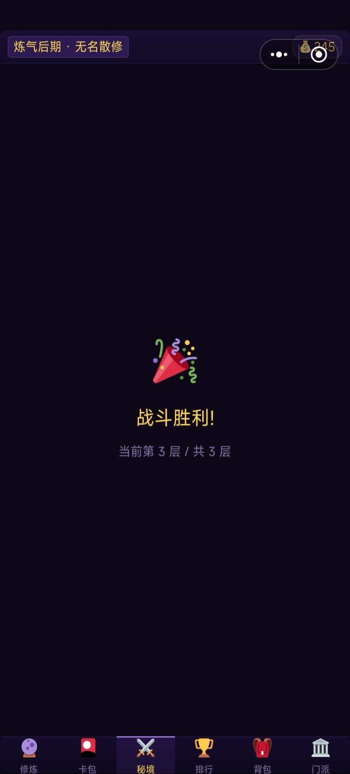 就是不断搜突破材料,太单一了,而且很多机制都不清楚,丹药不知道哪里使用,卡包太便宜了,后面一次采集十几万灵石,秘境卡片感觉没什么用,法宝后面没什么用,功法加百分比还有点用但不多,金色功法法宝永远打不过同境界的秘境第三层