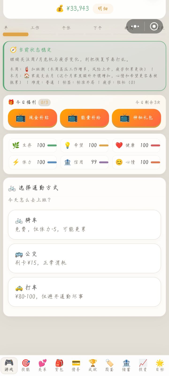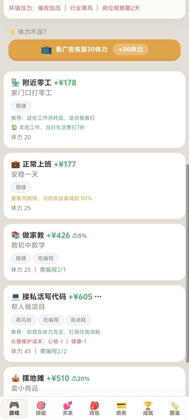 很多朋友看到这个游戏的第一反应,都是:“是不是就是一直上班、打工、还债、重复点点点?”说实话,我能理解这种感觉。因为这个游戏的前期,确实就是在那种很压人的状态里:钱不够,债很多,状态在掉,稍不注意就可能崩。你每天都在想怎么活下去,怎么把月供顶过去,怎么让自己不要倒在下一个危机前面。但我想认真说一句:这个游戏真的不只是一直重复打工。前面的辛苦,不是为了把玩家困在“机械上班”里,而是为了