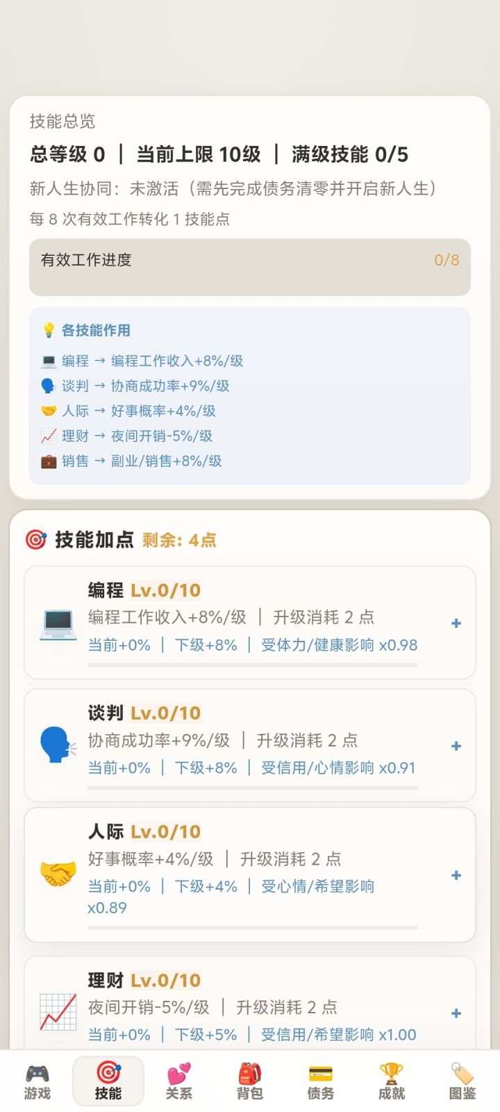 技能书bug一个技能满级默认所有技能满级,还有还款期间太牢了,能不能加个永久开局加成,不然没几个人会坐牢几个小时还债的。