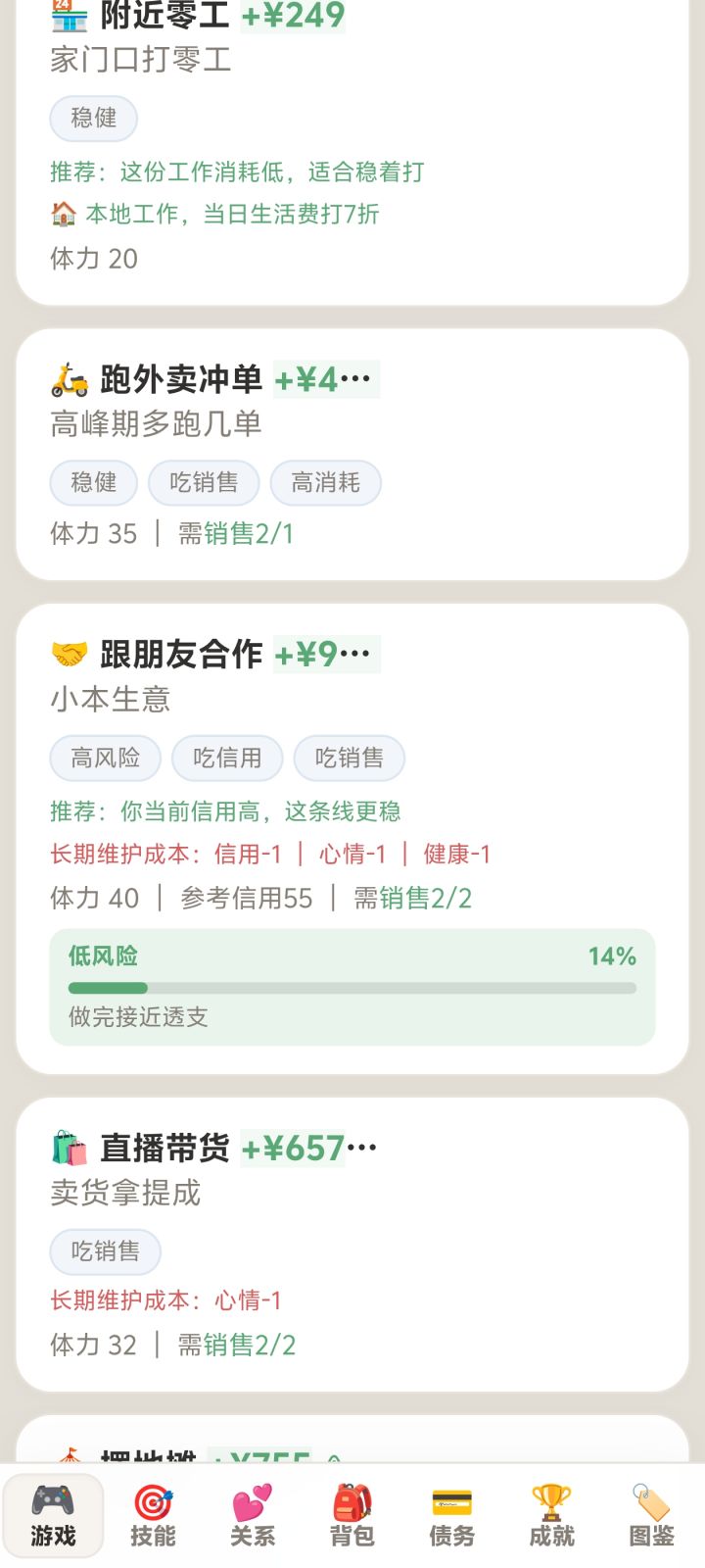 这次版本更新后,我认真看了大家的评论、建议和吐槽。很多反馈其实都指向了同一个问题:不是题材不行,也不是内容不够,而是现在的版本里,阅读量、点击量、重复操作和理解成本都偏高,导致大家容易累、容易烦、也更容易在前中期失去耐心。所以下个版本的更新方向,不会去硬改游戏的核心,不会把“负债求生”的压迫感改没,也不会把路线、事件和后债生活这些东西砍掉。这次更想做的,是把无效复杂、无效重复和无效点击减下来